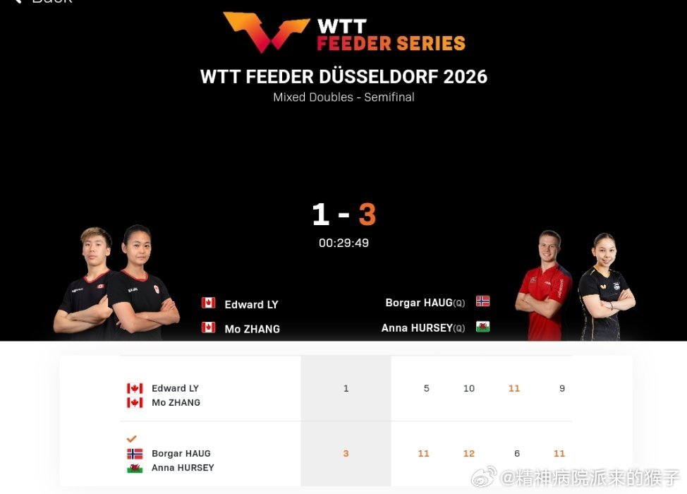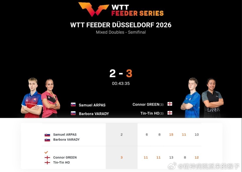 豪格赫尔希3比1李昱谆张默(5,10,-6,9)格林何天天3比2阿帕斯巴拉佐娃(6,8,-13,-8,10)晋级2026WTT杜塞尔多夫支线赛混双决赛决赛:豪格🇳🇴赫尔希🏴VS格林何天天🏴