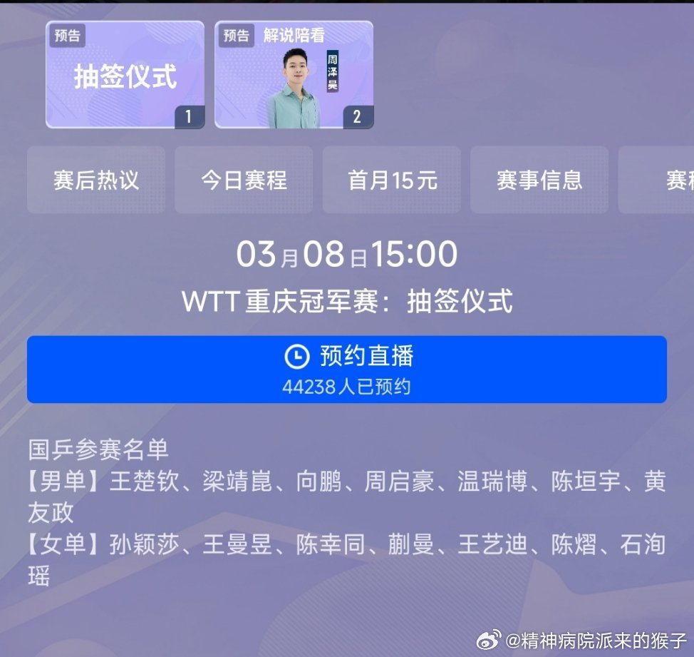 2026WTT重庆冠军赛抽签仪式:3月8日15:00进行