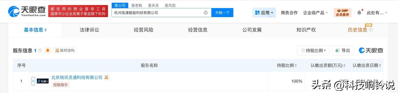 【阿里巴巴在杭州成立智能科技新公司 注册资本1000万】 天眼查工商信息显示,近日,杭州瓴通智能科技有限公司成立,法定代表人为林鸣晖,注册资本1000万人民币,经营范围包括软件开发、计算机软硬件及外围设备制造、数据处理和存储支持服务、大数据服务、互联网数据服务、人工智能应用软件开发等。股东信息显示,该公司由阿里巴巴旗下北京锐讯灵通科技有限公司全资持股。 天眼查信息: