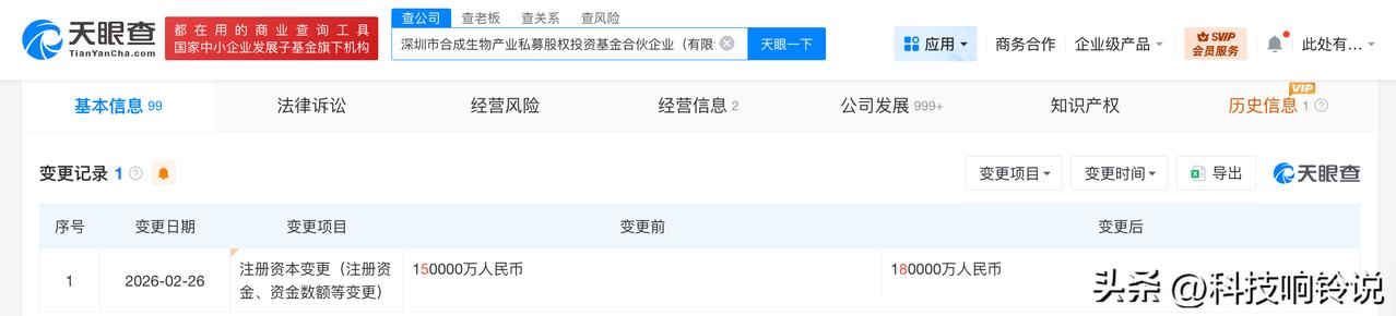【深圳合成生物产业私募基金增资至18亿 增幅20%】 天眼查工商信息显示,近日,深圳市合成生物产业私募股权投资基金合伙企业(有限合伙)发生工商变更,出资额由15亿人民币增至18亿人民币,增幅20%。 该基金成立于2024年4月,执行事务合伙人为深创投红土私募股权投资基金管理(深圳)有限公司,经营范围为以私募基金从事股权投资、投资管理、资产管理等活动,由深圳市引导基金投资有限公司、深圳市红土创业投资有限公司、深圳市光明区引导基金投资有限公司等共同出资。 天眼查信息: