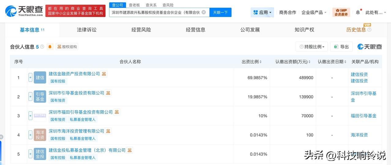 【建信投资等在深圳成立私募股权基金 出资额70亿】 天眼查工商信息显示,近日,深圳市建源政兴私募股权投资基金合伙企业(有限合伙)成立,执行事务合伙人为深圳市海洋投资管理有限公司、建信金投私募基金管理(北京)有限公司,出资额70亿人民币,经营范围为以私募基金从事股权投资、投资管理、资产管理等活动。合伙人信息显示,该基金由建信金融资产投资有限公司、深圳市引导基金投资有限公司、深圳市福田引导基金投资有限公司等共同出资。 天眼查信息: