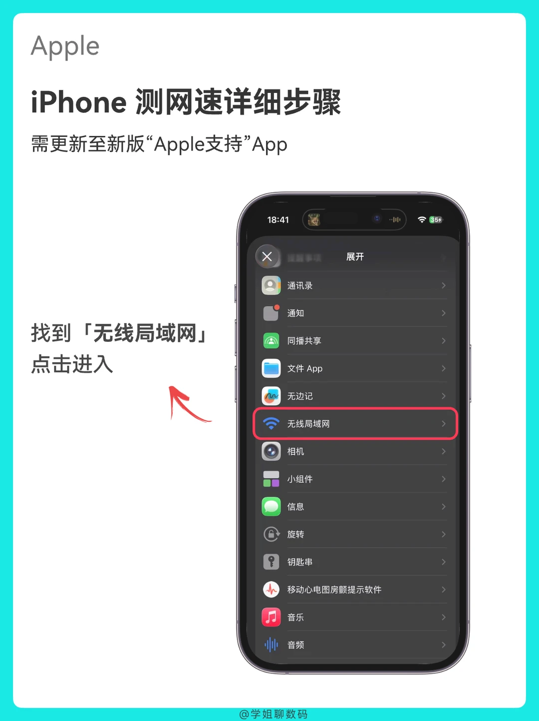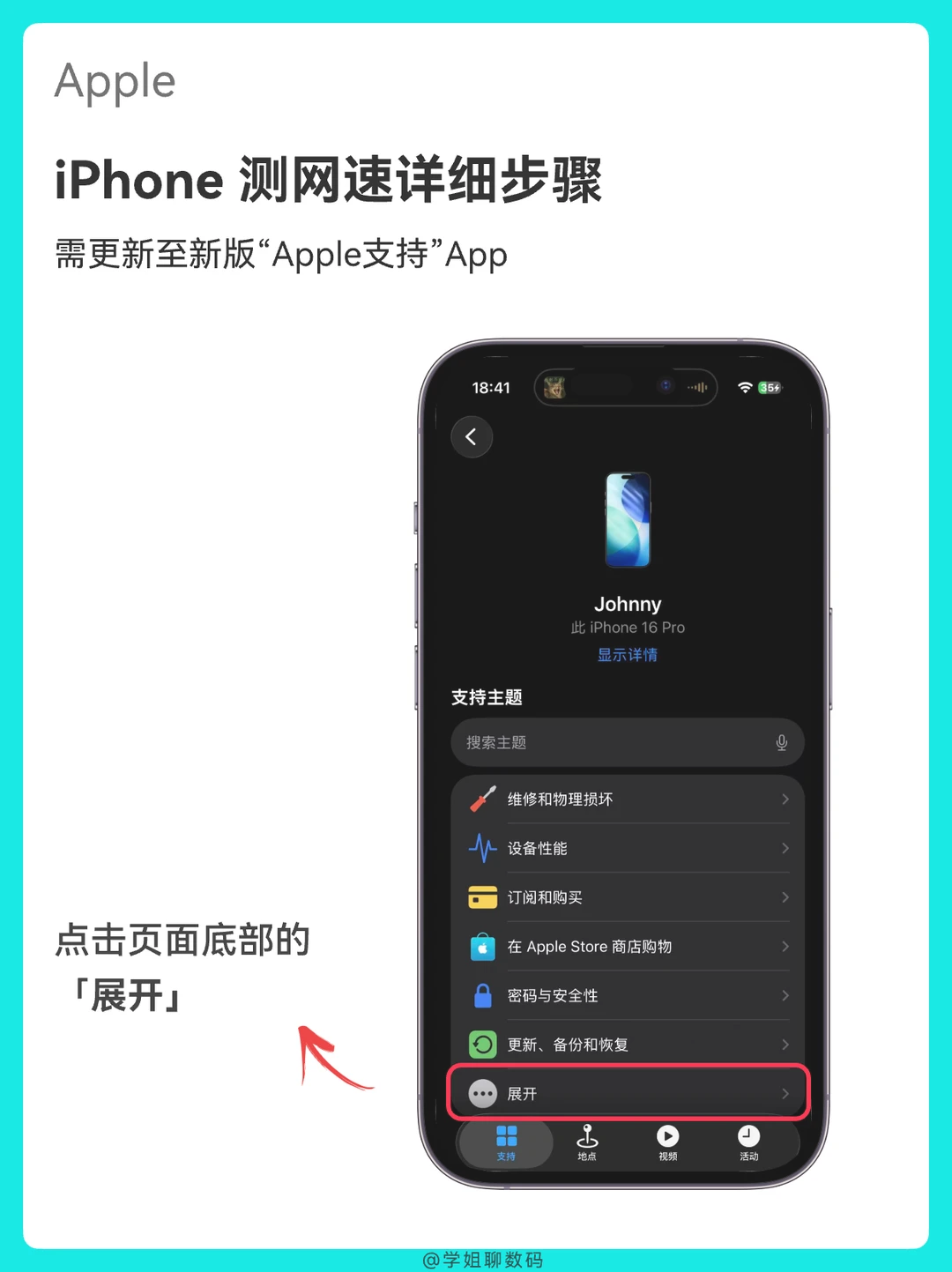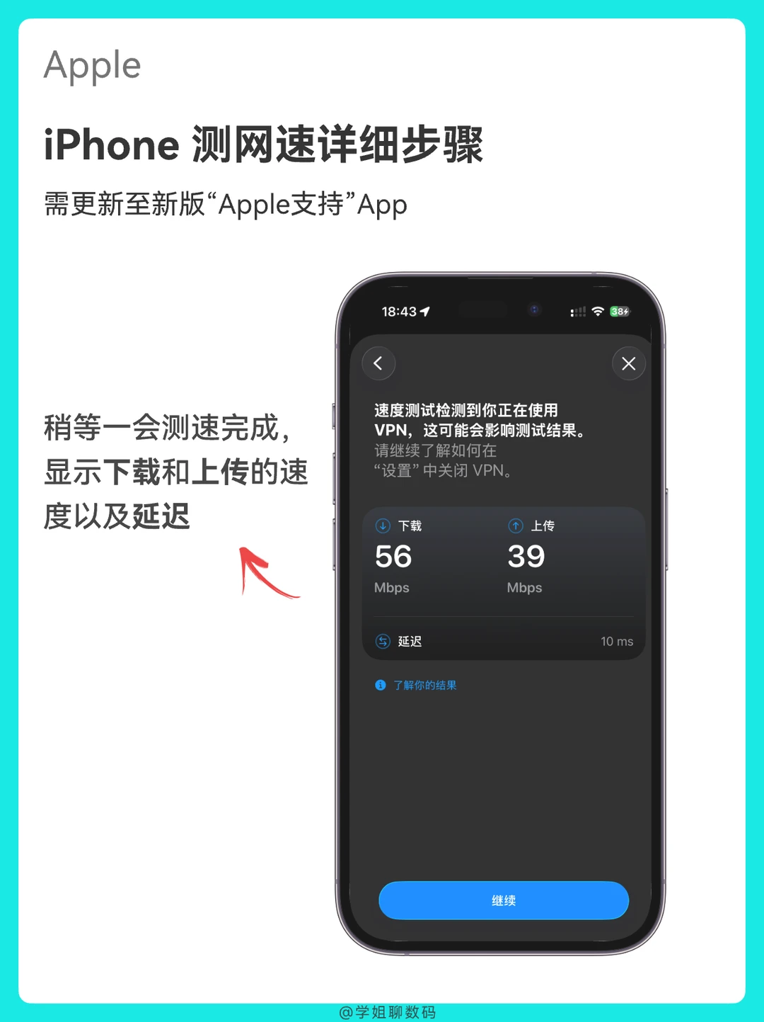 只要你的iPhone系统是iOS 26及以上版本,在「Apple支持」App就可以测试你的网速啦,不用再安装第三方App,一分钟就搞定!