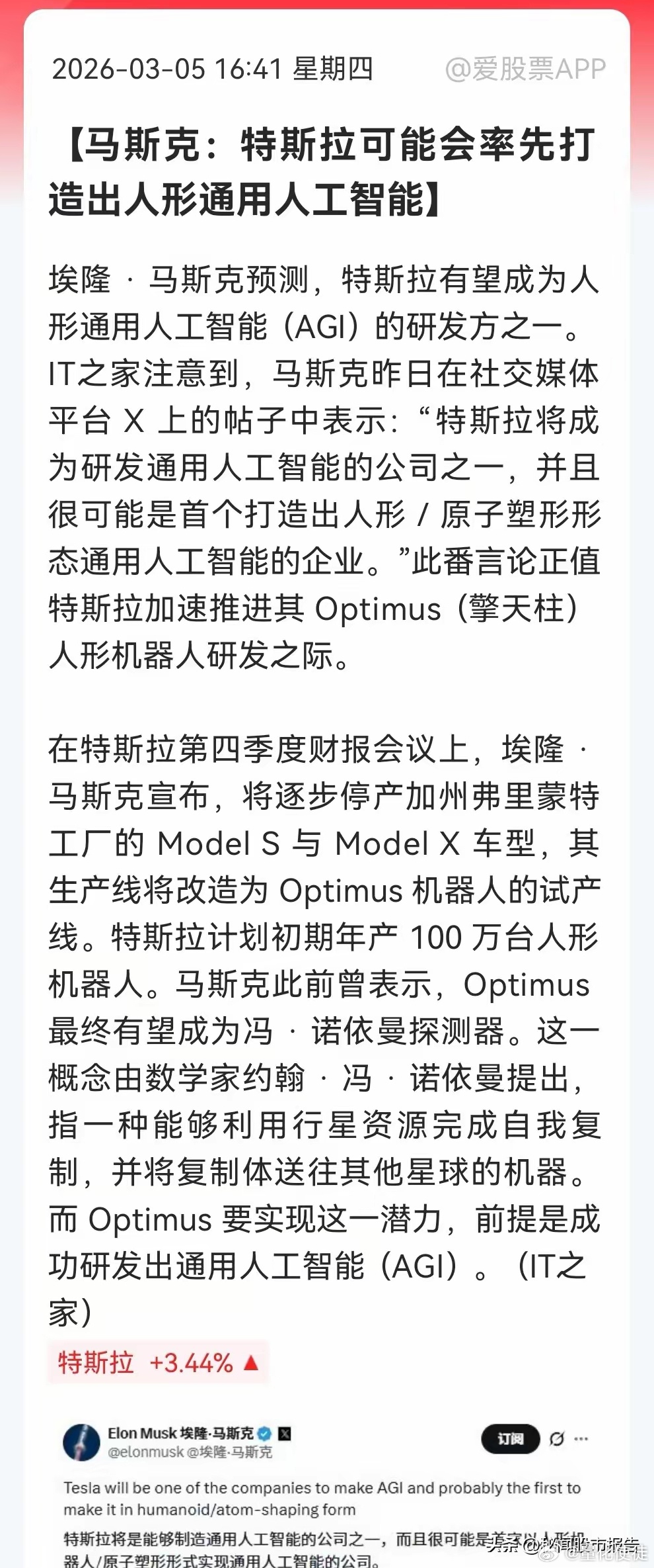 重磅快讯!特斯拉突然放大招,人形机器人板块迎来硬核利好,明天资金大概率要往这里吹了!马斯克在X平台直接表态:特斯拉将成为通用人工智能研发核心企业,极有可能率先做出人形通用人工智能。更关键的是,特斯拉已经在财报会上明确:加州弗里蒙特工厂停产Model S/X,产线直接改造为Optimus机器人试产线!之前年产100万台人形机器人的规划,这次是真要落地了。为什么这消息这么重磅?因为特斯拉走的是人形+通用AGI路线,相当于把机器人直接升级成具备类人思维、类人行动的智能体,智能化直接跨一个量级。目前国内人形机器人硬件不差,但在通用AI赋能这块,和特斯拉确实有差距,后续必然加速研发、加大投入,整个板块逻辑直接被打通。节后至今,人形机器人一直偏弱、明显跑输其他题材,这次重磅催化来了,就看能不能一根巨阳改三观,重回主线节奏!重点看特斯拉Optimus产业链,明天资金大概率抢跑。