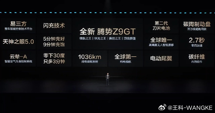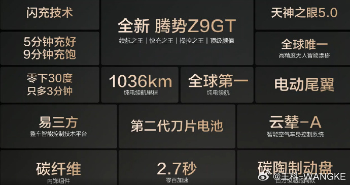 腾势Z9GT充电9分钟续航超千公里 3月5日,腾势Z9GT正式上市,26.98万起售。这回不玩虚的,直接给到单电机后驱版,CLTC纯电续航冲到1036km——实打实全球量产最长,城市通勤一周一充真不是口号。