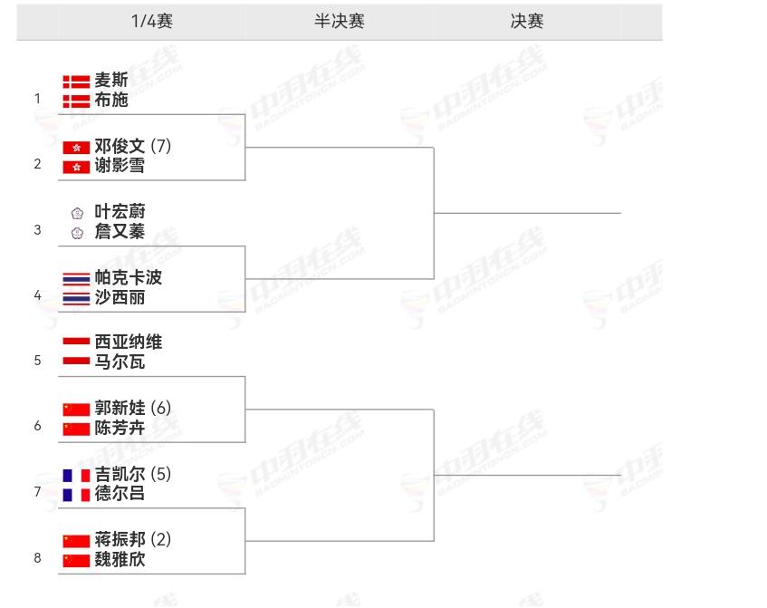 全英羽毛球公开赛混双八强产生, 国羽晋级的是娃卉组合和振欣组合,而凤凰组合被淘汰。 国羽两对晋级选手都在下半区,无法形成上下半区会师了。