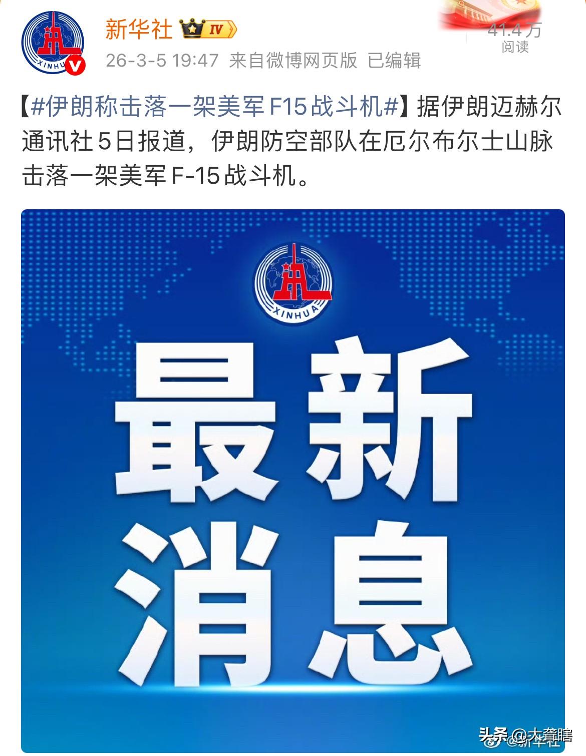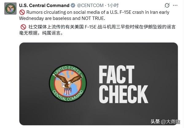 【美国否认F-15战斗机在伊朗境内被击落】 美国中央司令部在社交平台发文表示,关于F-15战斗机在伊朗境内坠毁的消息纯属谣言,是毫无根据的。 此前,伊朗媒体发布消息称伊朗防空部队在厄尔布尔士山脉击落了一架美军F-15战斗机。 不过,伊朗军方并未发布飞机被击落的佐证信息。