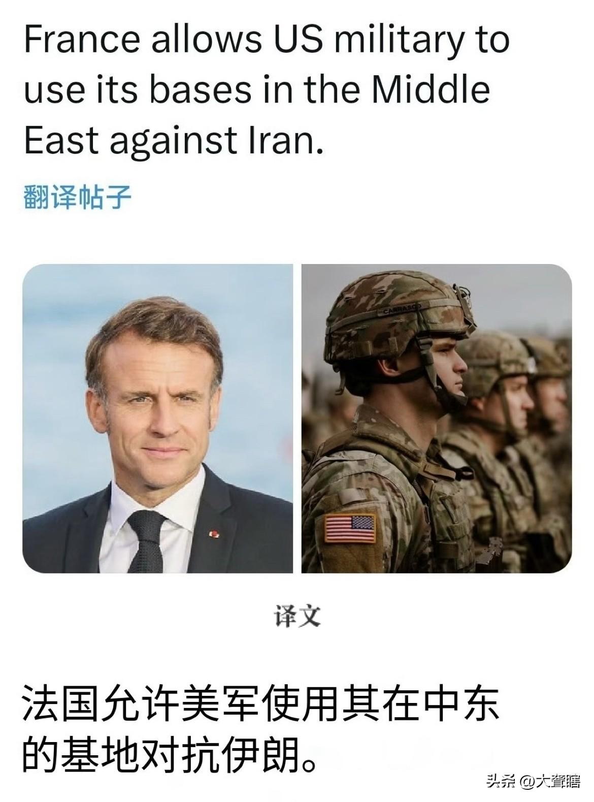 法国同意美军使用军事基地! 据外媒消息,法国军方对外表示,允许美国军机部署在中东地区的法国军事基地,这在两国合作关系框架之内,目的是保护海湾地区的合作伙伴。 当前,欧洲德国、英国和法国等国家匀表示不会直接参与美国和伊朗的战争,但是允许美国使用他们的军事基地进行防御性行动。