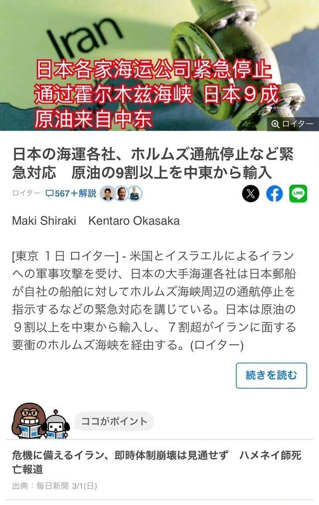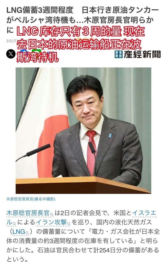 美伊战争继续,日本经济恐受重创!日本官房长官昨天承认,日本9成石油来自中东,7成要途径霍尔木兹海峡,,国内的液化天然气(LNG)储备仅剩约3周份。这个数据放在平时似乎还能勉强应付,但有电力公司人士指出,如果运输中断持续,“4月以后可能就会受到影响”。 现在中东局势还在恶化,美国和以色列对伊朗的军事行动没有停下来的迹象,伊朗那边直接把霍尔木兹海峡的通行给封了。这条海峡最窄的地方才33公里左右,是全球能源运输的咽喉要道。日本高度依赖从中东进口的能源,一旦这里卡住,整个供应链就直接断了。日本经济产业省的最新数据表明,2025财年日本原油进口中,中东来源占比高达95%以上,其中70%多必须走霍尔木兹海峡这条线。液化天然气这边,中东占比虽然只有10%到15%左右,但运输路径跟原油高度重合,船只过不去的话,这部分也等于瞬间归零。 日本官房长官在记者会上把情况摊开了说,日本原油九成以上靠中东,七成以上要过霍尔木兹海峡,国内石油战略储备加民间储备加起来,换算成净进口量能撑254天左右,其中国家部分146天,民间101天,还有产油国共同储备7天。数字听起来还行,但液化天然气库存就没这么厚实了,只剩全国消费量大约三周的量。平时这个库存够周转,可一旦中东通道真被堵死,三周的缓冲期根本扛不住连锁反应。电力行业内部评估过,如果运输中断拖到4月以后,东京等大城市地区的电力供应就会出问题。燃气公司也直言,储罐里的LNG剩余量每天都在变,实际能用的可能只有1到2周的波动空间,比官方报的数字更紧。 日本能源结构本身就偏脆弱,原油和LNG的运输通道重叠太多,多元化做得不够彻底。虽然这些年加大从美国、澳大利亚进口LNG的比例,但中东来源的低成本和大体量短期内没法完全取代。东京地区冬天特别冷的时候,一天城市燃气消耗就能吃掉一艘LNG船的量。如果中东那15%的份额没了,原本的三周库存得同时补这个窟窿,实际能撑的时间会大幅缩水。核电重启一直慢吞吞,很多反应堆还在审查阶段或者停机检修,电网的备用容量本来就不多,LNG一断供,电力缺口马上就露出来了。 更麻烦的是,这事直接砸到经济命门上。国际油价要是冲到每桶140美元以上,日本进口成本暴涨,实际GDP可能缩水3%左右,这对本来就增长乏力的日本经济来说,基本等于直接推入衰退。能源价格一飞,电费、燃气费、物流费用全跟着涨,超市里的食品、日用品价格跟着水涨船高,普通老百姓的生活开支压力瞬间加大。企业那边,生产成本抬高,利润被挤压,很多中小企业本来就靠薄利多销,扛不住这种输入性通胀。日元还在贬值通道里晃荡,贸易逆差越拉越大,形成恶性循环,输入型通胀加上经济停滞,叠加起来就是系统性风险。 这场危机其实早就埋下隐患,日本多年来在能源安全上喊得响,实际动作却慢。核电事故后对核能态度保守,LNG和原油高度依赖单一通道,地缘风险一上来就现原形。现在美伊冲突升级到这个地步,日本只能被动应对,一边争取外交斡旋,一边紧急找备用方案,但时间窗口很窄。民众生活和企业运转都开始感受到压力,电价燃气费通知单涨了,工厂开工率降了,股市能源板块也跟着跳水。这不是哪一家公司的事,而是整个经济体在面对外部冲击时的真实脆弱性。 总的来说,日本这次碰上的不是小麻烦,而是能源供应链断裂带来的全面连锁反应。储备数字看着体面,但实际用起来经不起折腾。中东通道一天不通,影响就累积一天,拖得越久,经济代价越大。日本政府现在只能硬着头皮顶,一边祈祷局势别进一步失控,一边想办法把损失控制在可承受范围内。可现实摆在那儿,依赖度这么高,缓冲期这么短,想完全躲过去基本没戏。