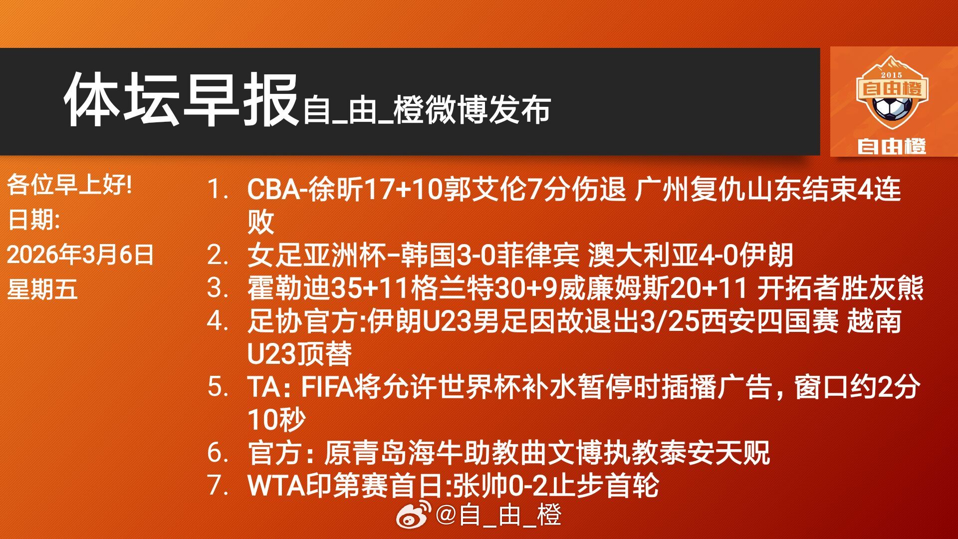 自由橙体坛早报每日橙语早安自由橙!