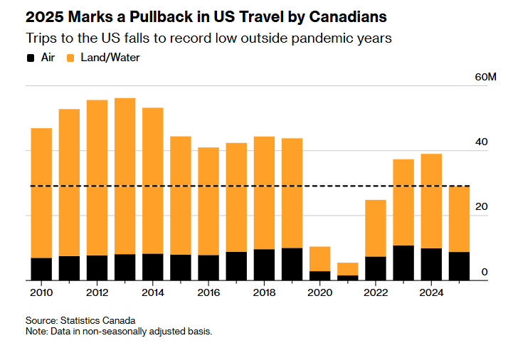 去年加拿大居民从美国返回的旅行次数下降约25%,而前往海外旅行同比增加9.2%。除疫情时期外,前往美国的总访问量降至历史最低。