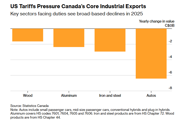 美国的保护主义立即冲击了加拿大经济。去年加拿大对美国的出口下降5.8%,创下自1988年有统计以来最大的贸易逆差(除新冠疫情期间一年外)。下降主要来自汽车、钢铁、铝和林业产品出口减少,这些行业都受到美国行业关税影响。