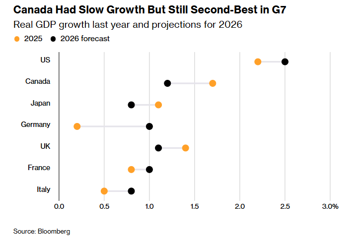 出口受挫拖累了经济增长。2025年加拿大实际国内生产总值仅增长1.7%,是自2020年经济收缩以来最低的年度增长率。