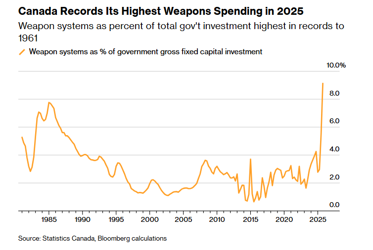 去年第四季度,加拿大联邦政府用于武器系统的投资占比达到至少1961年以来最高水平。