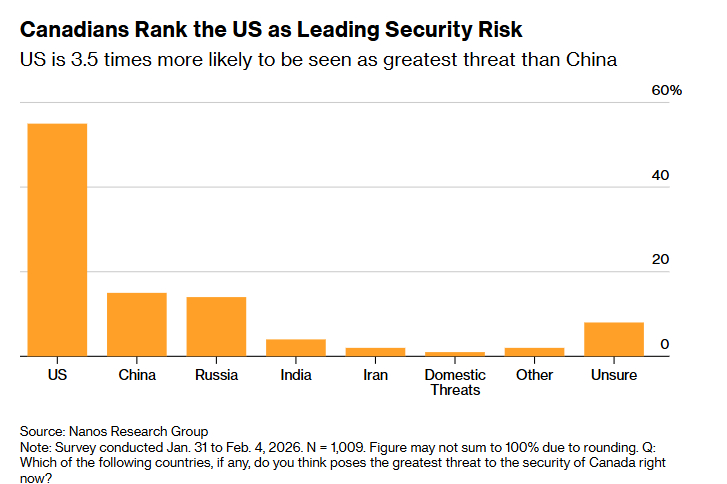 特朗普偶尔谈及加拿大主权问题,包括建议加拿大成为美国第51个州,也让许多加拿大人对美国产生不信任。彭博委托纳诺斯研究集团进行的一项民调显示,超过一半加拿大人认为美国是这个国家最大的安全威胁。