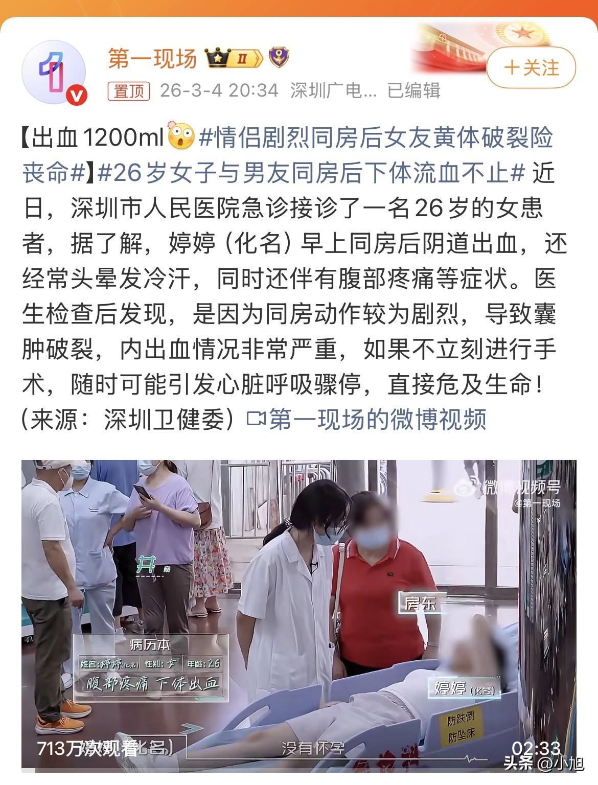 26岁的婷婷早上和男友同房后,肚子开始不对劲了。不是普通的疼,是那种闷闷的胀痛,下面还流血。她当时没当回事,以为歇歇就好。结果没过多久,头晕得厉害,浑身冒冷汗,脸色白得吓人。男友一看情况不对,赶紧把她往医院送 。 到了深圳市人民医院,医生一检查,直接让进手术室。腹腔里全是血,出血量高达1200毫升。啥概念?相当于全身四分之一的血没了。再晚来一会儿,心脏可能就停了 。 很多人不知道黄体是啥。它就在卵巢表面,每个月排卵后长出来,像个装满了毛细血管的"小气球",专门分泌孕激素为怀孕做准备 。平时也就1到3厘米大,但排卵后7到8天,也就是月经来前的那一周,它会长到最大,也最脆弱,血管全撑得薄薄的 。 医生后来解释说,同房时女性盆腔本来就充血,黄体里面张力高,再加上动作剧烈,下腹受到直接冲击,那个"小气球"当场就爆了 。爆了不可怕,可怕的是破口伤到了里面的血管,血哗哗往肚子里流。 婷婷被推进手术室时,腹腔已经像灌满了水。主刀医生赶紧清理积血、找到出血点、缝合破裂的卵巢。好在抢救及时,命保住了,卵巢也保住了 。 医生特别强调,黄体破裂最怕的不是破裂本身,而是内出血看不出来。表面人好好的,肚子里面已经血流成河。等头晕眼花、心慌乏力的时候,往往已经失血很多了 。 其实婷婷这种情况,每年急诊科都能碰上好几例。只是很多人都不知道,月经来前那一周,身体里那个"小气球"最不经撞。稍微用点力,不管是同房、跳绳、跑步,甚至便秘时用力排便,都可能出事 。 回头想想,婷婷那天早上要是再忍一忍、等一等,现在会是啥结果? 这事你怎么看?夫妻间的亲密,到底该注意点啥?