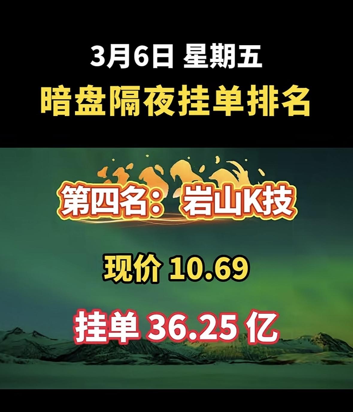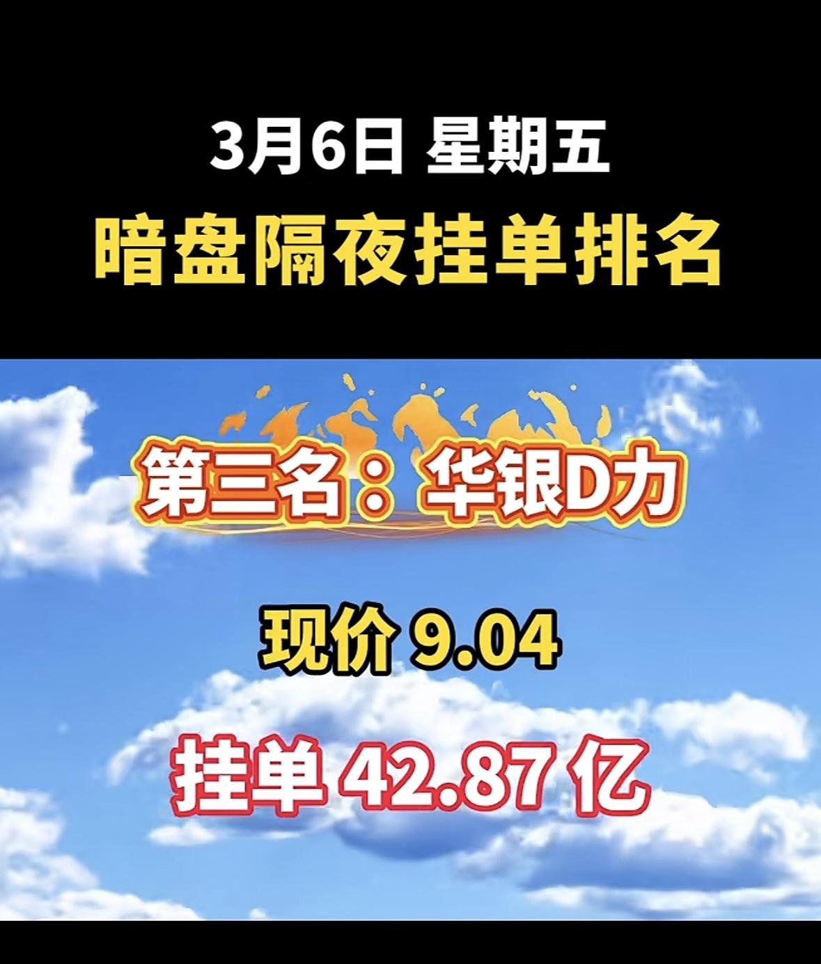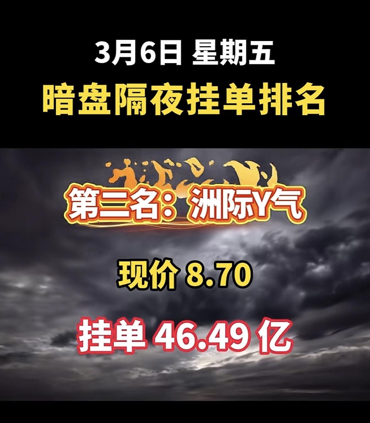2026年3月6日暗盘隔夜挂单前8名个股揭晓啦!华银电力(600744)也很猛,现价7.94元,挂单85.36亿,有绿色电力、新能源等概念。拓维信息(002261)、赣能股份(000899)等也都在榜单上。这些股票各有特色,有热门的人工智能、新能源概念,对于股民来说,可都是值得关注的对象,说不定能从中找到赚钱的机会呢。