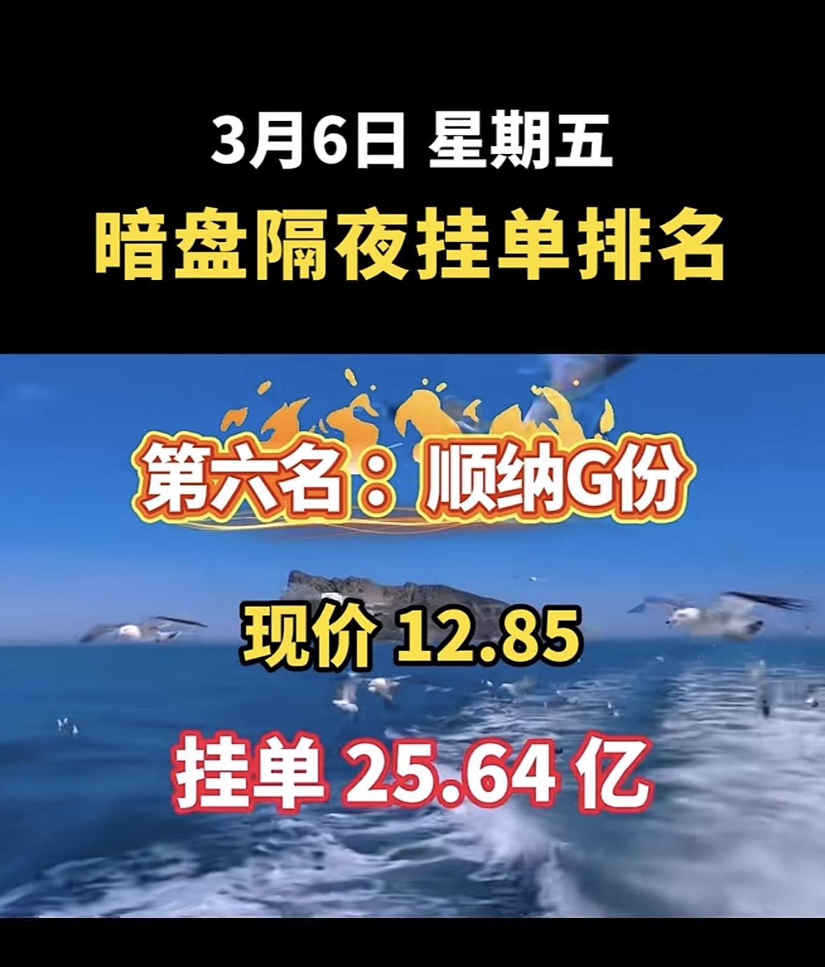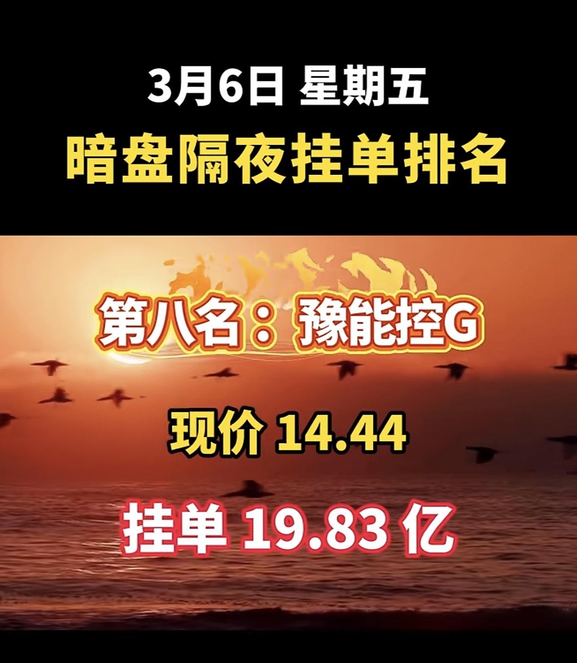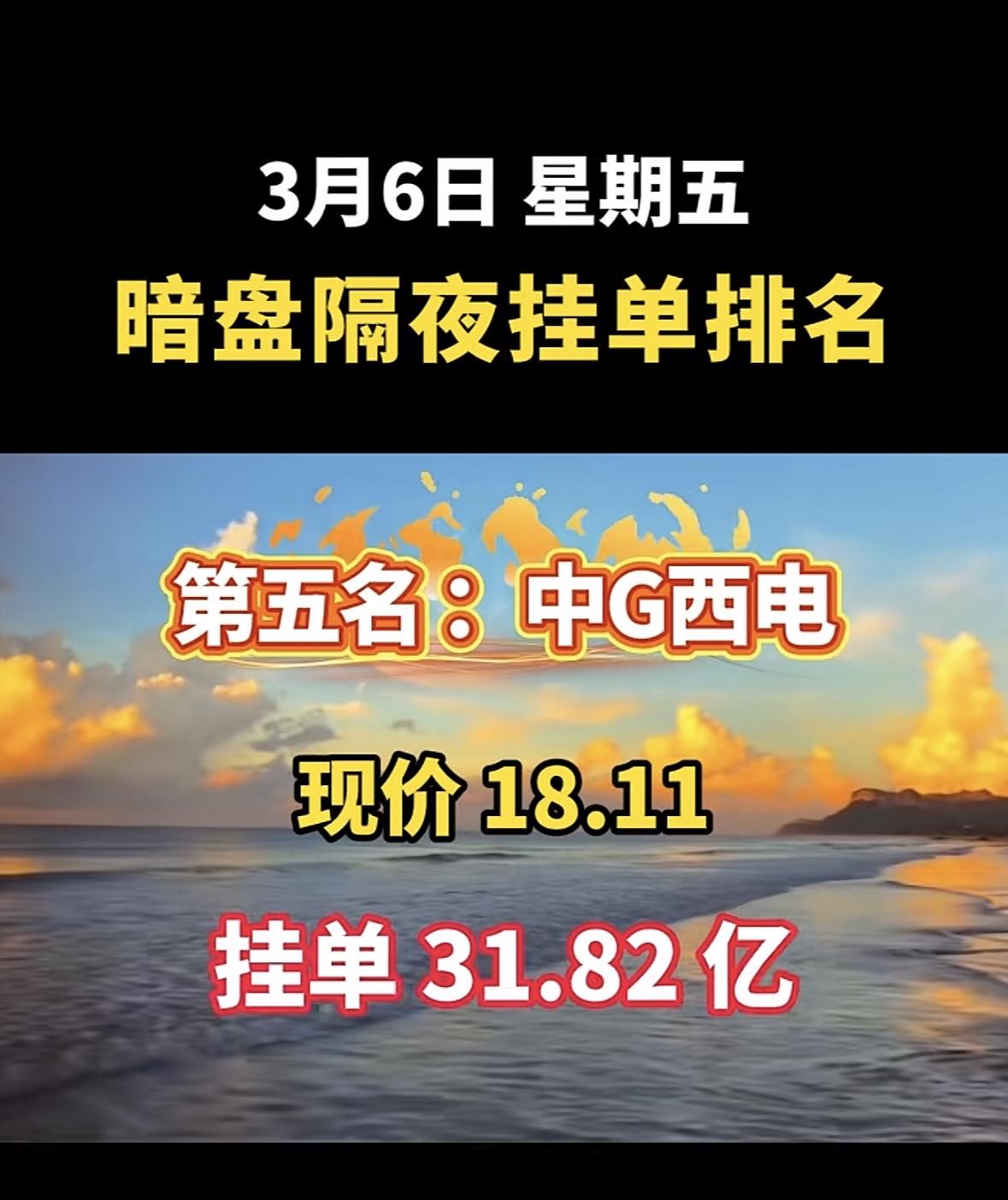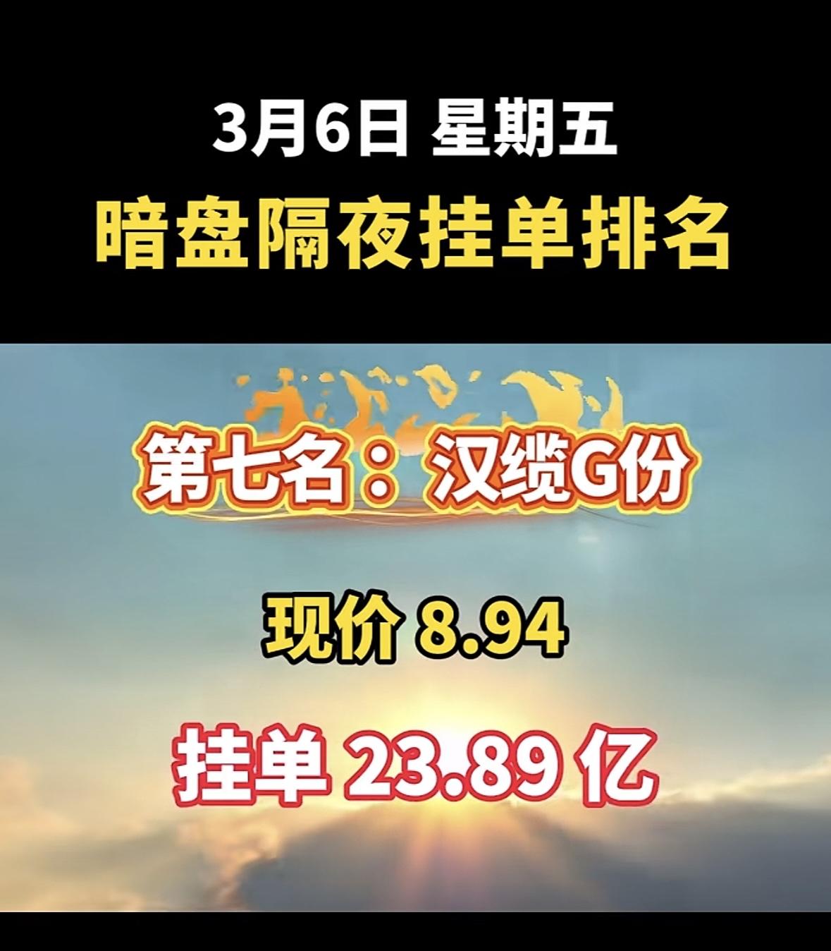 2026年3月6日暗盘隔夜挂单前8名个股揭晓啦!华银电力(600744)也很猛,现价7.94元,挂单85.36亿,有绿色电力、新能源等概念。拓维信息(002261)、赣能股份(000899)等也都在榜单上。这些股票各有特色,有热门的人工智能、新能源概念,对于股民来说,可都是值得关注的对象,说不定能从中找到赚钱的机会呢。