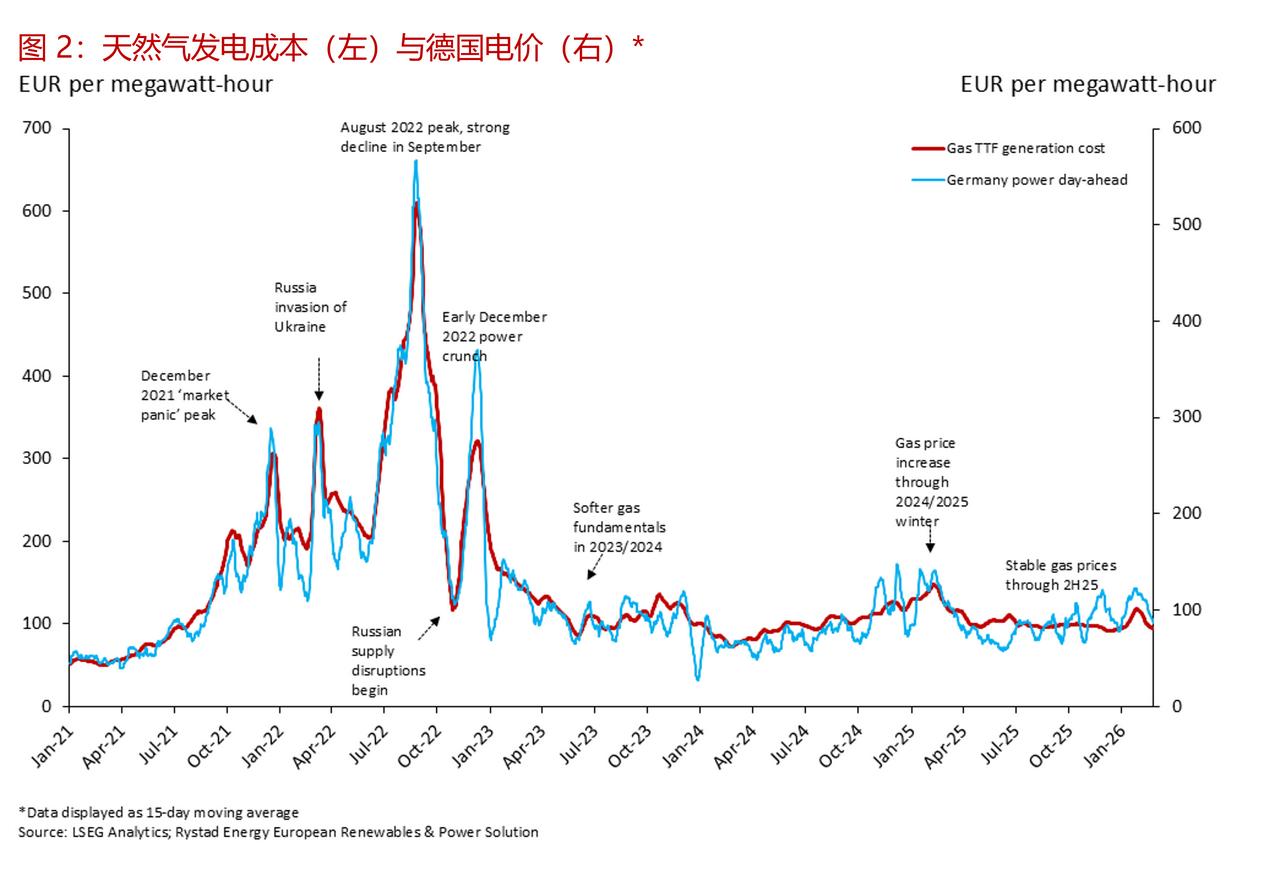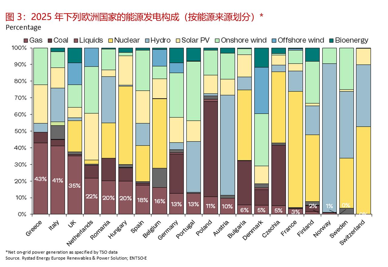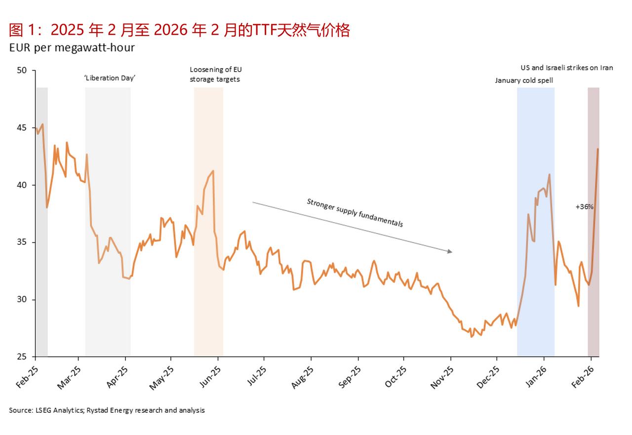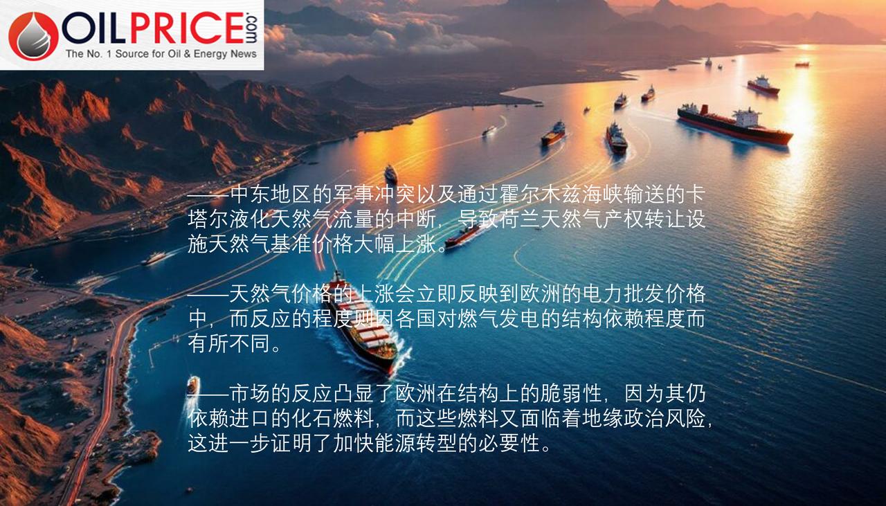 霍尔木兹海峡关闭导致欧洲天然气基准价格飙升 中东地区的军事打击行动以及霍尔木兹海峡的有效封锁,引发了过去一年欧洲天然气市场最为剧烈的波动。由于液化天然气(LNG)供应中断导致的市场混乱,荷兰天然气产权转让设施(TTF)基准价格大幅上涨。这一冲击直接传导至欧洲电力市场,不同国家的天然气依赖程度导致价格反应各不相同。除了短期的波动之外,市场反应也凸显了全球液化天然气供应、欧洲电力定价以及欧洲更广泛的能源安全路径之间的结构性联系。这种冲突的加剧进一步强化了加快能源转型的结构性理由。 ——霍尔木兹海峡关闭加剧了全球液化天然气的供需失衡状况 在上周末美国和以色列对伊朗发动袭击以及伊朗方面作出报复行动之后,全球天然气市场大幅波动。卡塔尔液化天然气的产量中断以及霍尔木兹海峡的关闭意味着全球液化天然气供应平衡出现了明显的收紧。这种反应在荷兰的 TTF 基准价格变动中有所体现,相关情况如图 1 所示。 截至 3 月 2 日股市收盘时, TTF较周末前的水平上涨了 36%,当天的交易价格更是上涨了近 50%。此次波动幅度之大使其成为过去一年中单日最大幅度的调整之一。 ——对欧洲电力市场的影响 天然气价格的变动并不仅限于商品市场,而是会通过市场的定价机制直接传导至欧洲的电力批发价格中。 如图 2 所示,德国的电力批发价格(此处将其作为反映整个欧洲形势的指标)与燃气发电的成本走势高度一致。这种关系表明了天然气在边际价格形成过程中的核心作用。欧洲的天然气发电成本与 TTF 基准价格紧密相关,而 TTF 基准价格又与全球液化天然气的供需状况紧密相连。 ——传输量会因电力结构的不同而有所变化 这种关联程度取决于天然气在每个国家电力系统中的结构作用。如图 3 所示,去年意大利的天然气发电占比约为 41%,英国为 35%,德国为 13%,而法国仅为 3%。在天然气在发电中所占份额较大的地区,它更频繁地决定边际价格,从而将 TTF 的变动直接嵌入到电力批发价格中。 这种结构性关系在 3 月 2 日市场收盘时的期货价格走势中有所体现。英国的近月合约价格上涨了 19.5%,意大利的上涨了 13.5%,德国的上涨了 7.4%。这种反应的幅度大致反映了每个系统中天然气的相对重要性。在天然气在边际价格形成中起主导作用的英国和意大利,涨幅最为显著。而天然气占比较低但仍相当可观的德国,涨幅则较为温和。 相比之下,法国股市在 3 月 2 日收盘时下跌了 14%。由于天然气在该国的发电结构中所占比例极小,因此从 TTF 交易所直接传导至法国批发价格的机制在结构上是有限的。因此,这一下跌表明市场特定因素(包括流动性状况和持仓情况)在塑造短期反应方面所起的作用要大于天然气的基本面因素。 ——持续的波动性增强了与天然气相关的输电业务。 自 3 月 2 日股市收盘以来,市场波动加剧。在 3 月 3 日下午的交易中,TTF 近期合约较前一日收盘价进一步上涨了 28%,交易价格约为每兆瓦时 57 欧元(约合 66 美元)。这一变动表明,在充满不确定性的环境下,市场仍在重新评估现有的液化天然气供应情况。 电力市场也在相应地进行调整。截至 3 月 3 日下午早些时候,德国的近月合约价格上涨了约 31%,意大利的合约价格上涨了约 20%,而法国的合约价格则上涨了约 16%。法国市场的逆转表明,3 月 2 日的下跌部分可能反映了短期的仓位调整动态,而非结构性的基本面因素。 综合来看,最新的举措进一步强化了而非违背了上述所阐述的核心机制:那些天然气暴露程度更高的系统对TTF基准价格的变动表现出了更强且更迅速的敏感性。在不确定性加剧的环境下,价格的发现过程依然具有高度的反应性。 ——能源安全及其结构性影响 如果冲突持续存在且供应中断情况持续不变,其影响将超出短期波动范畴。较高的 TTF 水平会抬高远期电力价格曲线,尤其是在依赖天然气的市场中,这通过提高捕获价格和收入预期,增强了可再生能源项目的经济效益。 从根本上说,中东地区的这场战争很可能会使政策视野重新聚焦于能源安全问题。在上周末和本周的袭击事件之后,天然气和电力市场的大幅波动表明,欧洲的结构性弱点在于其对受地缘政治风险影响的进口化石燃料的持续依赖。霍尔布兹海峡 霍尔木兹危机
