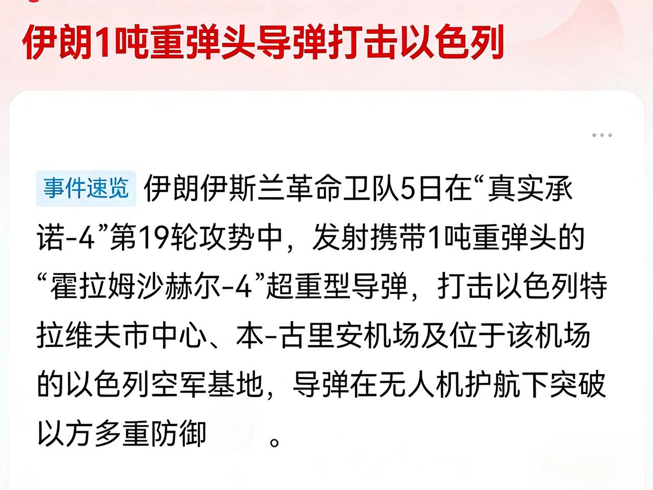 伊朗越打越自信!当地时间3月5日,伊朗伊斯兰革命卫队宣布,在“真实承诺-4”第19波攻势中,发射“霍拉姆沙赫尔-4”超重型导弹,携1吨级弹头精准打击以色列核心目标区域,特拉维夫市中心、本-古里安机场及机场内以空军基地。 该导弹射程可以覆盖以色列全境,大气层外速度可达16马赫,搭配无人机先遣护航,能轻松突破以军多层反导防御,威慑力那是杠杠的!此前第18轮打击,伊朗已覆盖中东20多个美军目标,可谓遍地开花。 这场硬碰硬的对抗,正在改写中东安全格局,也正在改变世界格局! 伊朗1吨重弹头导弹打击以色列伊朗命中目标 伊朗导弹部队 伊朗战果