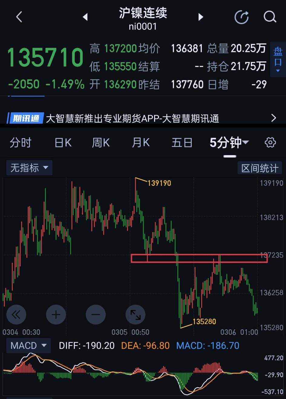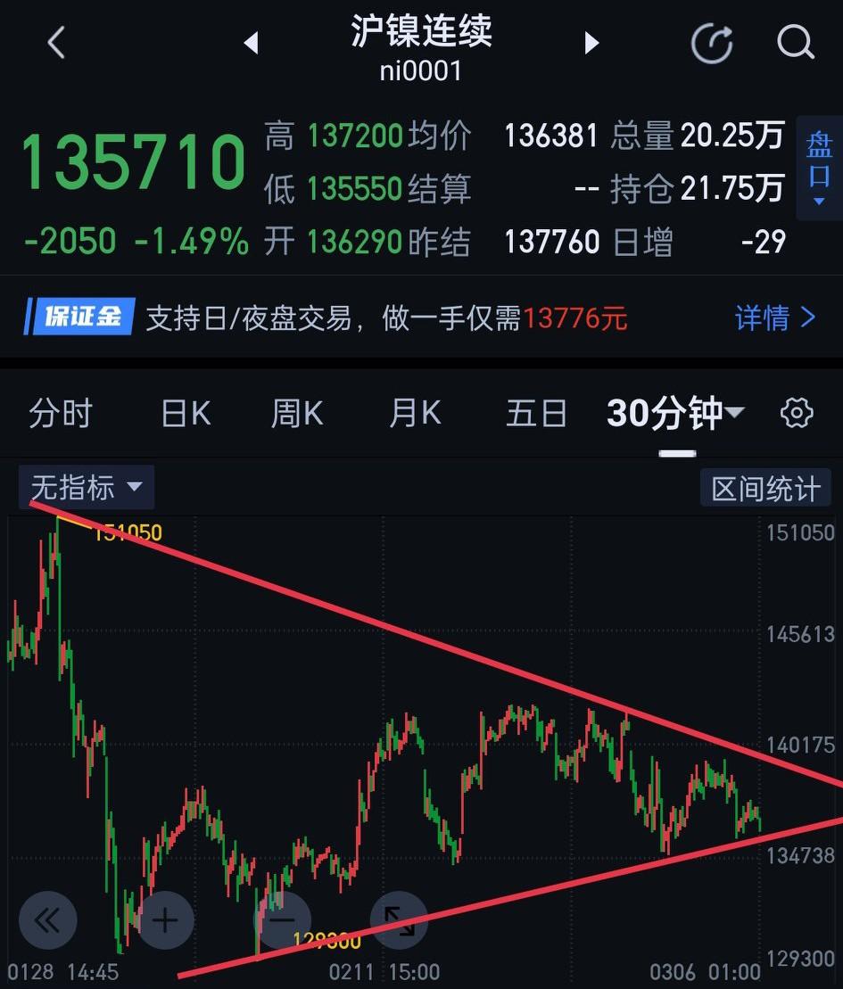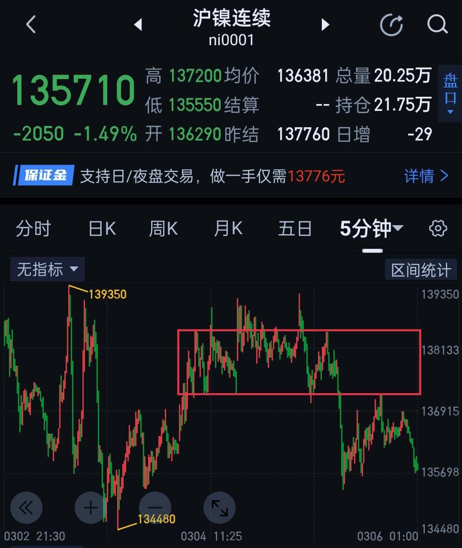 沪镍,近期震荡收敛的形态已近极致,变盘已是箭在弦上。最近印尼左右摇摆政策,一直在拨弄着镍矿价格敏感的神经,资本与政策间的博弈也是该见分晓的时刻了。 结构上,夜盘的反弹并未形成图(3)的三卖,显示多头在此位置还没放弃,仍心存一丝幻想。最终是多头的幻想照进现实,还是上演空头辣手摧花?日盘应该会给骑墙看戏的投资者提供答案。日盘能否有效站稳135280是关键。站稳,短时间内沪镍走势仍处于混沌期,阶段性方向仍待确认,操作上仍需保守些。如不能站稳,可参考图(4)一分钟中枢下降结构对应操作,后期的支撑暂看129300附近。