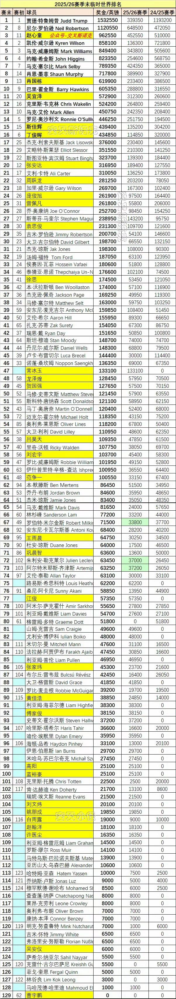 下赛季不用等太久,赵心童就能登顶世界第一!单赛季奖金榜:赵心童排名榜首,萝卜第二,75三杰同列前十。 赵心童本赛季奖金452550英镑,特鲁姆普本赛季奖金339350英镑,下赛季将陆续扣掉沙特大师赛在内的超过100万英镑巨分,可以说在下赛季的沙特大师赛到世锦赛之前,都是赵心童冲击世界第一的绝好机会。 最危险的是丁俊晖,本赛季奖金仅114850英镑,目前临时排名第16,大概率很难保住这位置。 图一:包含了排名赛、邀请赛、单杆最高分、首轮出局奖金。 图二:最新赛季末临时排名,扣除了玉山赛、巡回锦标赛、世锦赛奖金。