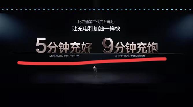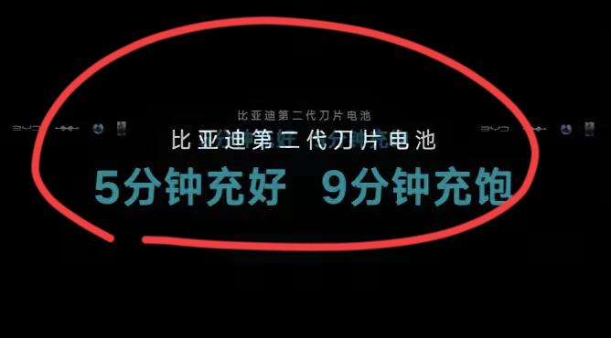 比亚迪又出来放大招了!! 第二代刀片电池横空出世。 广告语也很牛,5分钟充好,9分钟充饱! 看来,电车还是要回归到技术层面。 什么品牌高端化,都是伪命题。 战略决定胜败,技术决定生死。 那些没有核心技术的,终究会被市场淘汰。 困难是暂时,未来是光明的。 相信比亚迪会继续成为世界新能源汽车的领导者,加油!!