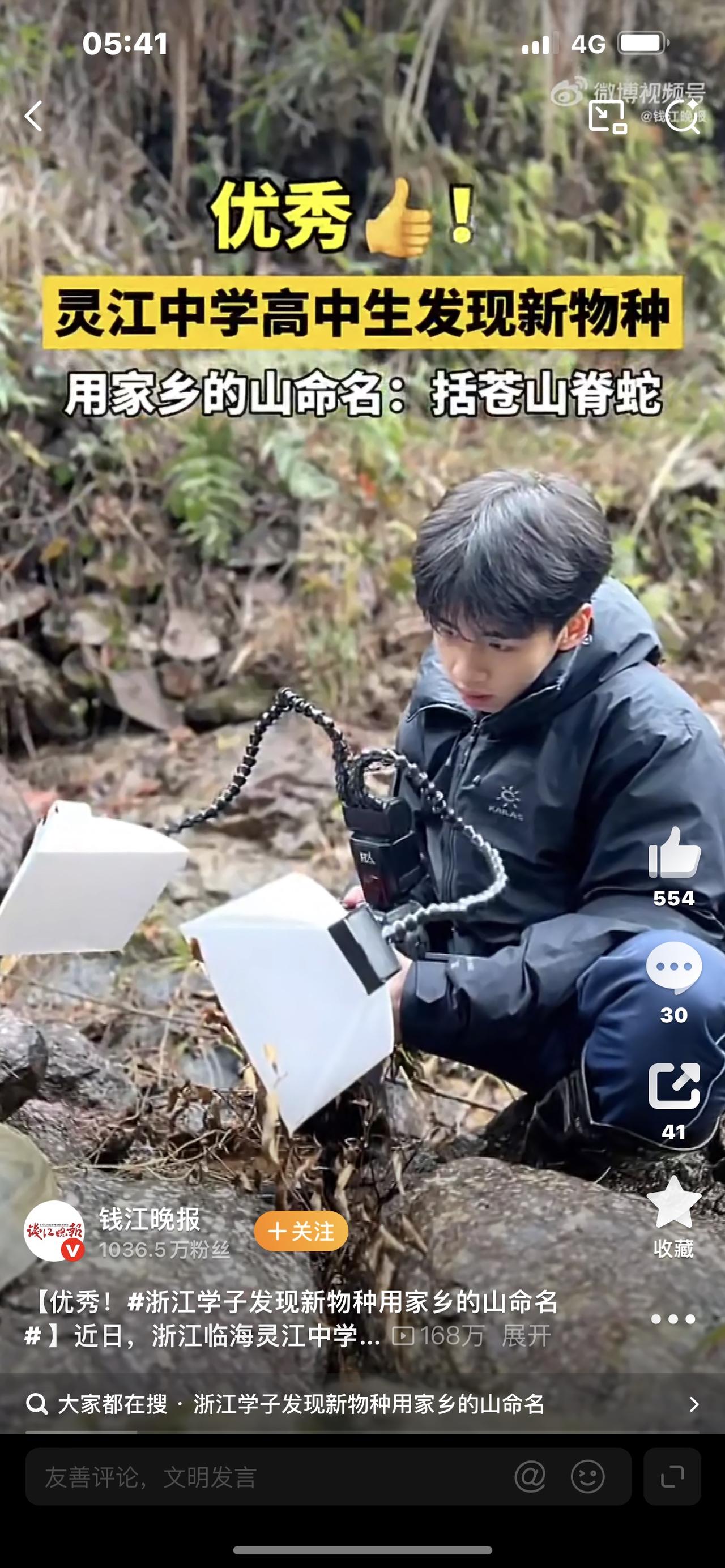 逆天!17岁高中生深山发现新物种,刷山40夜直接发SCI,太给中国人长脸! 你敢信吗?别人17岁还在刷题追星,浙江这位17岁男生,竟然在深山里发现全新蛇种,还凭一己之力把成果送上国际SCI期刊,轰动整个生物界! 这条蛇因为体型纤细,只有筷子粗细,被网友亲切叫做筷子蛇,学名括苍山脊蛇,这可是20世纪以来,首个模式产地在浙江的爬行动物新物种,意义非同一般! 很多人以为这是运气爆棚,殊不知,背后是少年熬出来的奇迹。最开始专家只发现过残缺的蛇尸,标本严重不足,研究直接陷入停滞。就在所有人束手无策时,还是高中生的胡家豪主动站出来,非要进山找到完整样本。 别人的暑假是吹空调、玩游戏,他的暑假,全在黑夜里的深山里度过。每天往返近百公里山路,背着十几斤的专业设备,连续40多个夜晚进山刷山,蚊虫叮咬、山路崎岖、深夜恐惧,他全都扛了下来。 无数次的失望而归,他从没放弃。终于在一个深夜,一条30厘米长的小蛇横穿山路,他一眼就认出,这就是苦苦寻觅的目标!靠着这份执念,他陆续集齐5份关键标本,为鉴定提供了决定性证据。 基因测序结果更让人震撼:筷子蛇和近缘蛇类遗传差异高达9.5%-10.9%,要知道人类和黑猩猩的基因差异才1.2%,铁证如山,这就是从未被记载的全新物种! 没有优越的条件,没有专业的团队,一个普通高中生,凭着纯粹的热爱和死磕到底的坚持,填补了我国生物多样性的空白,被专家盛赞是不可或缺的关键力量。 这才是新时代少年该有的样子!不是只有读书一条路,把热爱做到极致,平凡人也能创造不凡。他用行动证明,年轻就是无限可能,坚持和热爱,永远是最厉害的天赋。 为这位00后少年点赞,这才是我们最该追的星!愿每一份热爱都不被辜负,每一份坚持都能开花结果。