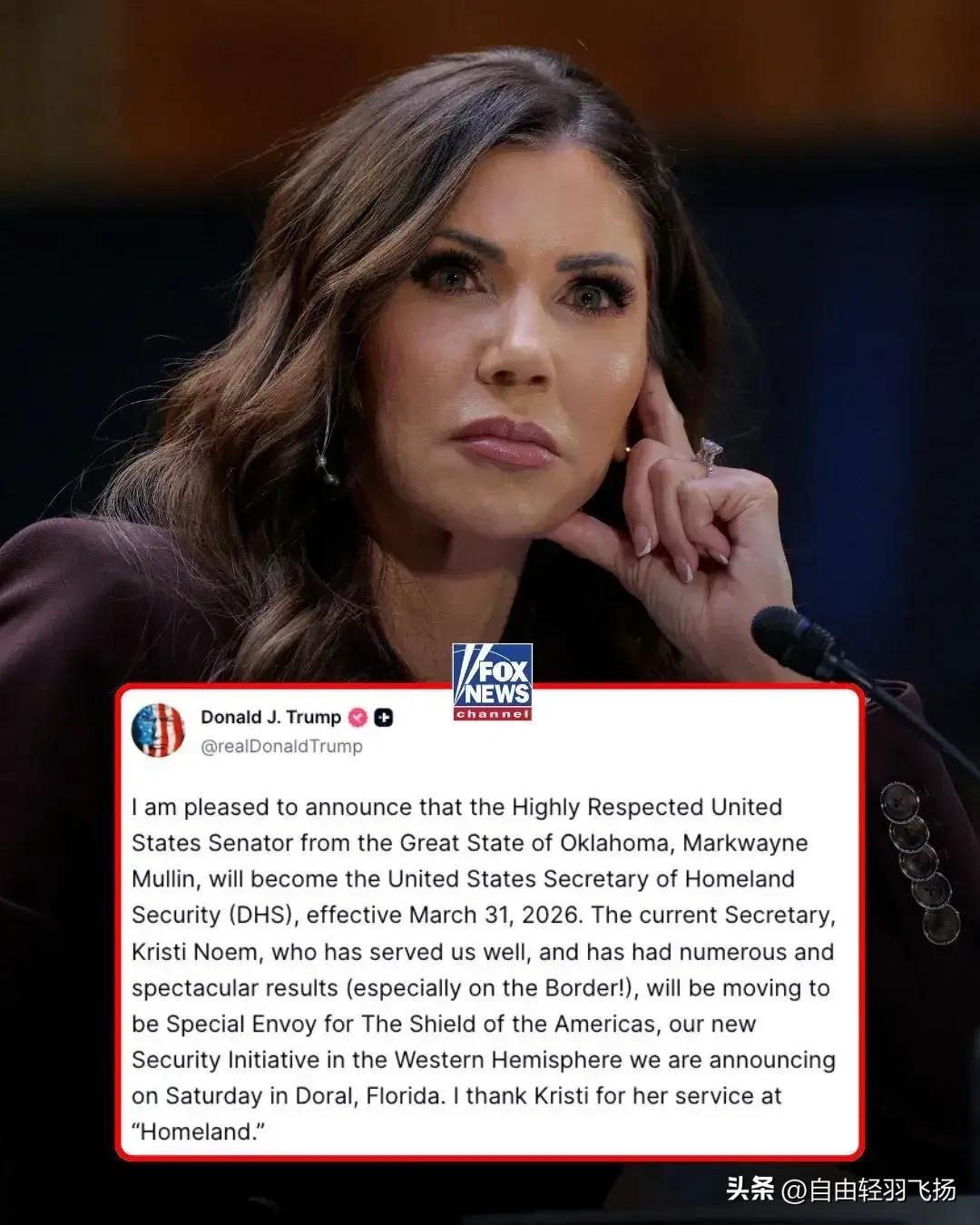 美国土安全部长诺姆被解职!特朗普3月5日解除克里斯蒂·诺姆的国土安全部长职务,新任国土安全部长由俄克拉荷马州共和党参议员马奎因·马林担任。 说起来,诺姆曾是特朗普移民政策的“急先锋”。2025年推动超200万人“自愿遣返”,手上沾着不少争议。可这一次,她栽在了明尼苏达州——联邦特工违规执法,两条美国公民的命没了。 出事之后,诺姆嘴硬得很,拒不认账,这下彻底捅了马蜂窝。国会山两边都炸了锅,民主党众议员杰弗里斯2月24日就放话:海关与移民执法局已经无法无天,必须大刀阔斧改革。 诺姆不下台,民主党绝不放行国土安全部的拨款。当天参议院的拨款法案果然卡了壳,部门至今还有部分停摆。更要命的是,连共和党人都看不下去了。 本周国会听证会上,诺姆的表现一塌糊涂,自家阵营都公开表示不满。特朗普再护着,也只能壮士断腕——丢卒保车,这话用在这儿再合适不过。 有人说,诺姆就是个替罪羊。可细想,这背后是美国政治那套纠错机制在起作用。三权分立不是摆设,总统和政府想胡来,没那么容易。 当年特朗普想给全球加征关税,最高法院一句话就否了,他再不服气,也只能憋着。这次免掉诺姆,说白了就是给特朗普的移民政策违规执法踩刹车。 这事儿透着个理:美国的总统不是皇帝,不能想干啥就干啥。前阵子特朗普脑热,想动武抢丹麦的格陵兰岛,民调出来,支持率才4%,吓得他再也不敢提了。 诺姆的下场,像面镜子照出美国政治的弯弯绕。她替特朗普挡过枪,也为自己的强硬付出了代价。可换上来的马林,就能顺顺当当?未必。 移民问题本就是个烫手山芋,民主党盯着,共和党内部也有分歧,稍有不慎,可能就是下一个诺姆。说到底,政治这碗饭不好吃。 替老板干活,得有分寸;触碰了底线,谁也保不住。诺姆的离开,既是她个人的结局,也是美国制度运转的一个缩影——再大的权力,也得有个框框罩着,不然迟早要栽跟头。 接下来,国土安全部的拨款能不能过?马林能不能镇住场子?都是未知数。但至少眼下,诺姆的案例明明白白告诉所有人:在其位,就得担其责,硬扛着不认账,最终只会把自己逼上绝路。