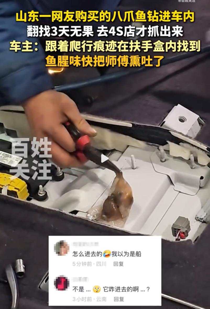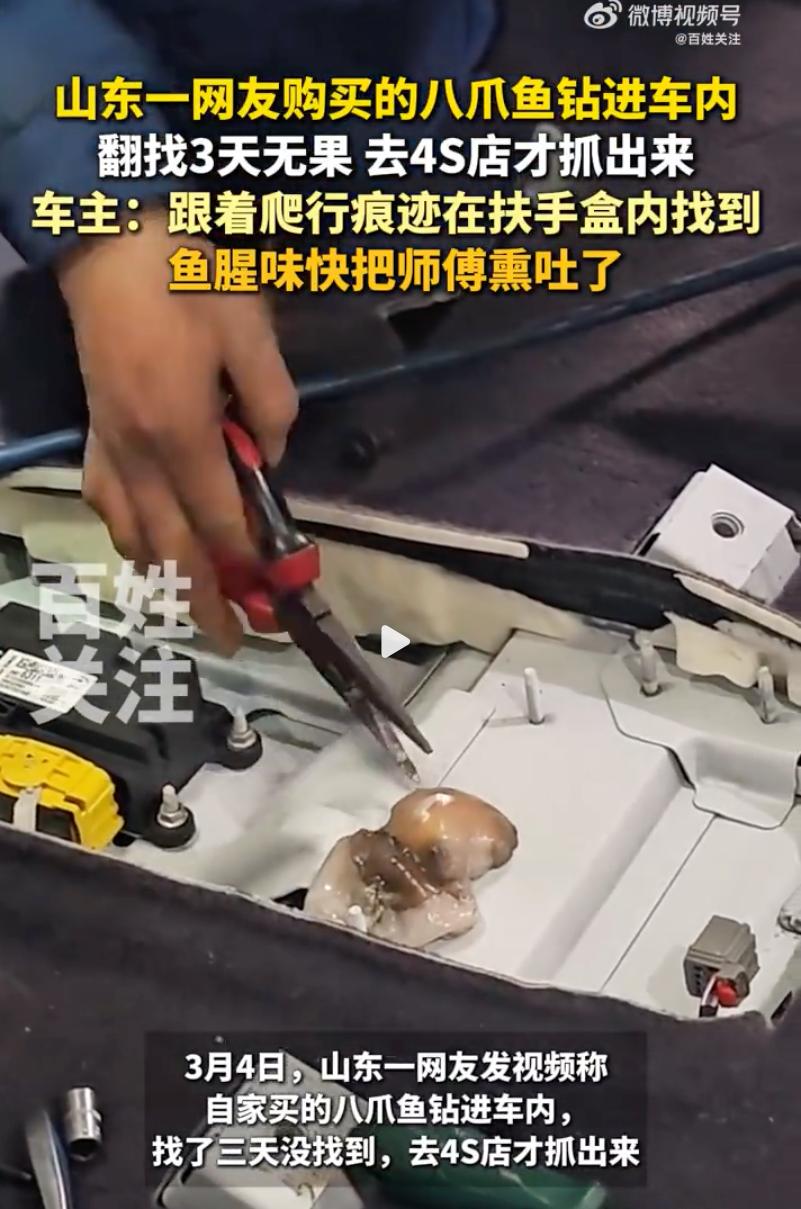 笑不活了!山东一车主买的八爪鱼在车里“越狱”了,找了三天愣是没见影,最后不得不把车开进4S店拆车。网友调侃:这哪是修车,这分明是去4S店赶海去了! 3月4日,山东这位车主买了几只活八爪鱼放车上,半路一个急刹车,其中一只趁乱钻进了座椅缝隙,彻底玩起了失踪。 车主回家翻了个底朝天,座椅夹层、空调口、后备箱全找遍了,甚至喷了满车除味剂,可那股子腥臭味反而一天比一天冲。 连着找了三天,人都要被熏麻了,甚至连空调内循环都不敢开,生怕这玩意儿烂在里面腐蚀了线路。 实在没招了,只能求助4S店。 维修师傅也是头回见这场面,顺着八爪鱼爬行留下的白色黏液,一路摸排到了副驾驶扶手箱内部。 等把盖板撬开那一瞬间,一股浓烈到顶脑门的腐臭气味喷涌而出,师傅当场被熏得直干呕,差点没吐在车里。 最后在夹层空洞里揪出了那只八爪鱼,已经死透了,体液和腥味渗了一地。 有网友说:幸亏是冬天,这要是赶上三伏天,这股子味儿能让满车人都吐翻,车直接报废。 也有人感慨:自家的车也进过老鼠,拆了一个多小时才在油箱那儿找到,这种活物进车里最折磨人。 这事看完真的还挺逗,这八爪鱼真会找地方,还好最后找到了,不然后患无穷。 不过话说回来,八爪鱼的这种“越狱”和“躲藏”,恰恰是它最厉害的生存本能。咱常说的八爪鱼学名叫章鱼,属于头足类软体动物,跟鱿鱼、乌贼是亲戚。它们身上没硬骨头,靠着柔软的身体和超高的智商,只要嘴能钻过去的地方,全身都能挤过去。 以后大家出门要是带这种活鲜,一定要拿厚塑料袋扎死口,最好再套个带盖的大水桶压实。 别指望它能老老实实待着,它们可是海洋里顶级的逃脱大师。生活处处有意外,再别让这八爪鱼逃了。