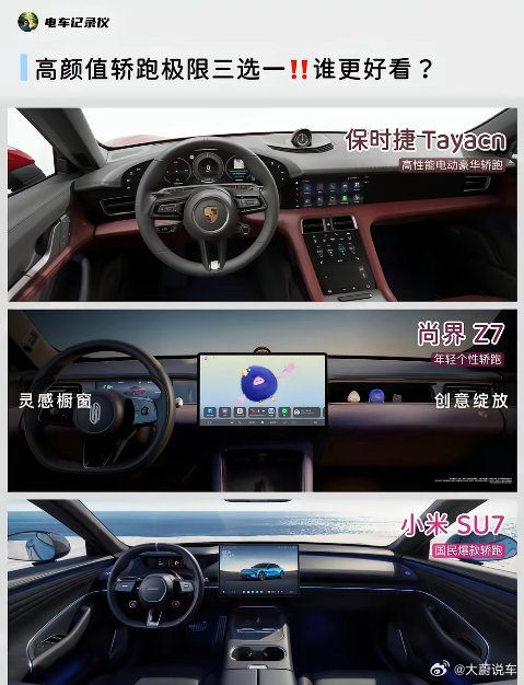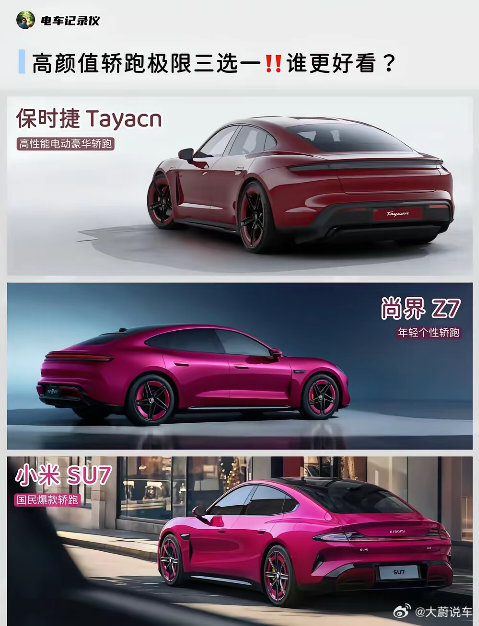 保时捷Taycan:真拿你们两个没办法😅就在今天,尚界Z7在鸿蒙智行技术发布会上迎来正式首秀,不仅公布了外观图,连内饰设计也能看出大概。尚界Z7此次公布的外观色是电光紫粉,呈现出粉色和紫色的混合状态,整体看上去非常动感时尚。不过目前轿跑市场面临的竞争压力也不小,就那爆款车型来看,小米SU7和保时捷Tacyan是其中的佼佼者。尚界Z7的登场,也让这场谁是高颜值轿跑的较量愈发有意思了!就拿这三款轿跑车型来看,你觉得谁的颜值更高呢?新能源汽车 汽车推荐 尚界 尚界Z7 小米su7 保时捷Taycan 轿跑