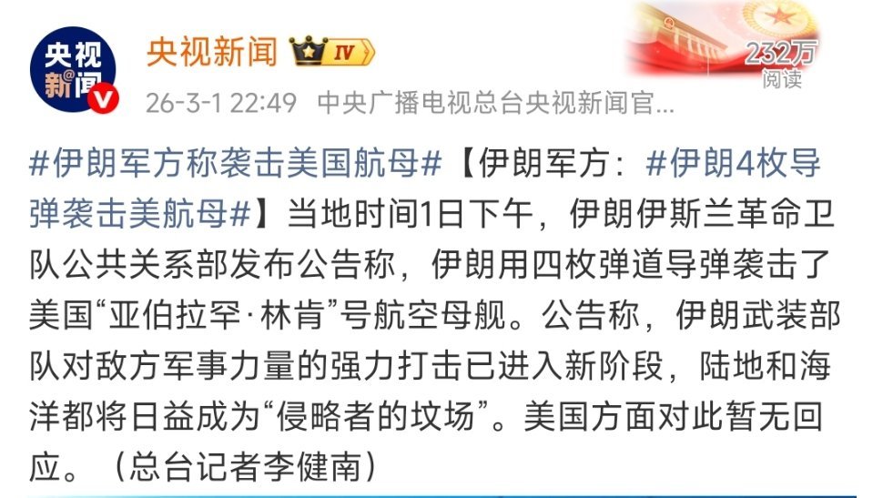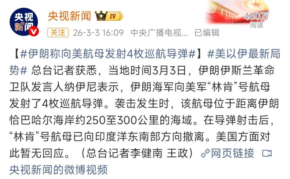 【#伊军方称用无人机击中美林肯号航母#】当地时间3月5日,伊朗武装部队哈塔姆·安
