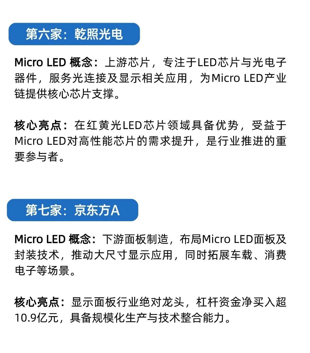 7、京东方A:下游面板制造布局MicroLED面板及封装,推动大尺寸应用,拓展车载、消费电子,显示面板龙头。