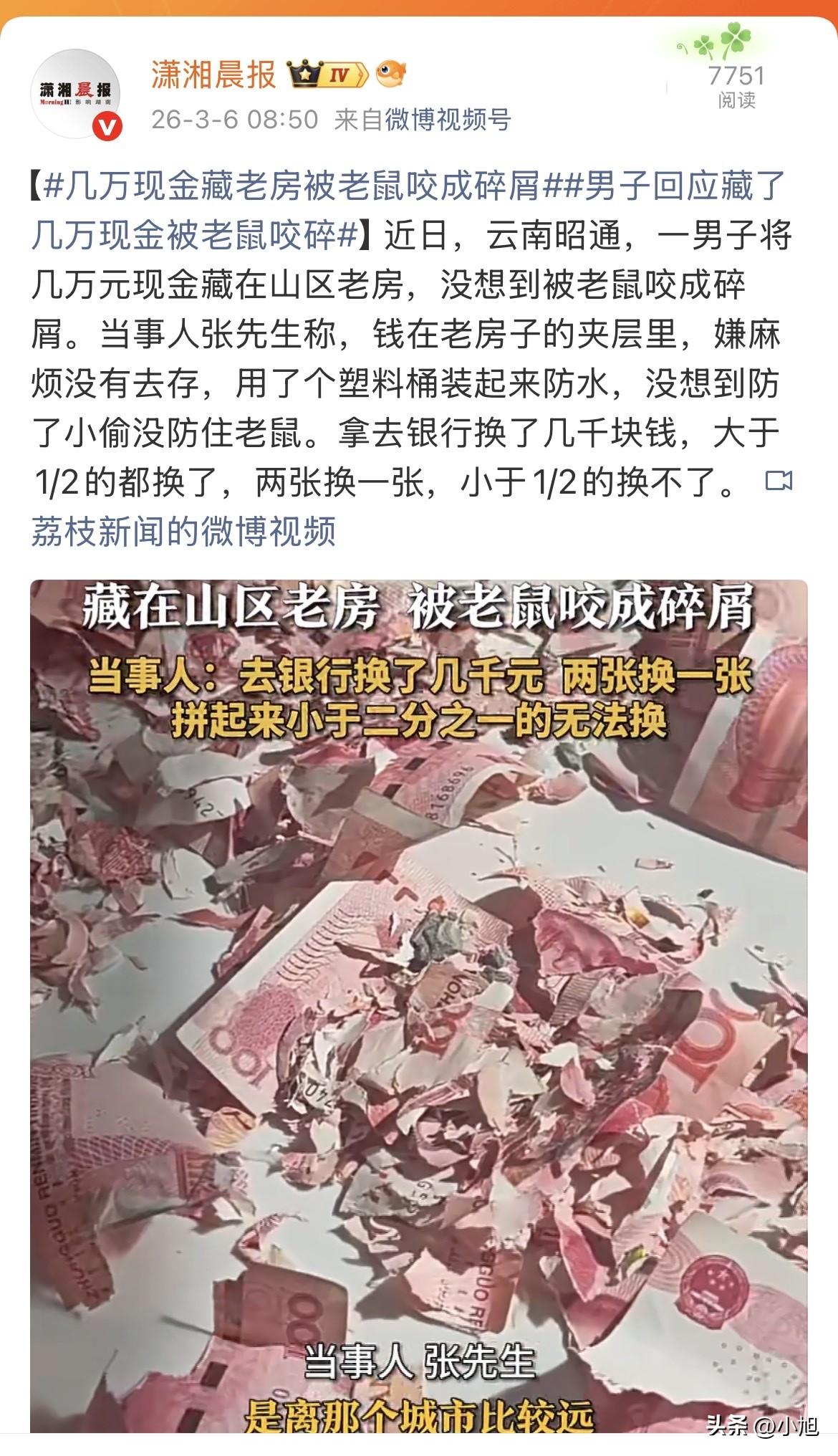 绷不住了!云南昭通一位大哥,把几万块现金藏在家里,结果被老鼠咬成了碎屑 。 钱是在老房子夹层里找到的。张先生平时打零工,钱就这么一笔笔攒下来,装在塑料桶里,用胶带缠了好几圈,想着放在夹层里,水泡不着,小偷找不着,万无一失 。 他是给孩子存的钱。山里人去趟银行不容易,来回折腾,就一直这么放着,想等攒得多一点再一块儿存 。 那天打开一看,人直接傻眼了。塑料桶被咬了个大窟窿,里面全是碎纸屑和老鼠屎。老鼠不光咬钱,还在里头安了家 。 几万块,就这么成了老鼠的窝垫。拼都拼不回来,手一碰就掉渣 。 拿到银行,工作人员拼了半天,最后换回来几千块。缺一半以上的,银行不收;能拼出大半的,两张才能换一张 。 有人说他心大,几万块不存银行。也有人说山里人用钱不方便,能理解。张先生自己好几宿睡不着,难受的不光是钱,那是他一趟一趟打工攒下来的,是给孩子留的 。 这种事其实不少见。有人藏墙缝里被老鼠啃,有人塞灶台下一把火烧了,有人放柜子里自己忘了 。老鼠哪知道那是钱,它只知道这东西软和,撕碎了垫窝正好。 这事说到底,钱这东西,藏得再好,不如存个踏实。银行排队是麻烦,但总比看着一堆碎纸渣干瞪眼强。 你们家老人有藏钱的习惯吗?评论区聊聊。
