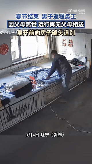 泪目了,辽宁,一男子独自回到无人居住的老家过年,春节结束后,男子又要踏上返程务工之路,可因为父母已经离世,他再也不能像往年那样有父母相送,所以他离开前,只能含泪向老房子磕头道别。 视频中,男子一个人默默收拾着床上的被子,全部整理好之后就准备开车离去,等车开出院子,他直接下车跪在门前,朝着老屋的方向深深磕了三个头,最后起身锁好大门,才不舍的离开。 以前男子离家时,都有父母在门口叮嘱、目送,心里有牵挂有依靠,如今父母不在,他只能自己锁门,独自上路。 对此有网友表示,太破防了,父母在,才有家,父母不在,老家只剩空房,只剩归途。男子的这一跪,跪的是思念,敬的是父母,不舍的是故乡。 还有网友表示,自己特别能共情,许多在外打拼的人也都有同感,远离家乡谋生,牵挂的从来不是房子,而是屋里的亲人,男子看似简单的磕头动作,却藏着最深的思念。 父母是根,根没了,走到哪都是漂泊,所以一定要珍惜和父母相处的时光,多回家看看,别留遗憾,能陪在爸妈身边,还有家可回,就是最大的幸福。 愿天下父母安康,也愿每一个漂泊在外的人,都能心中有暖,归途有盼,生活安稳无忧。