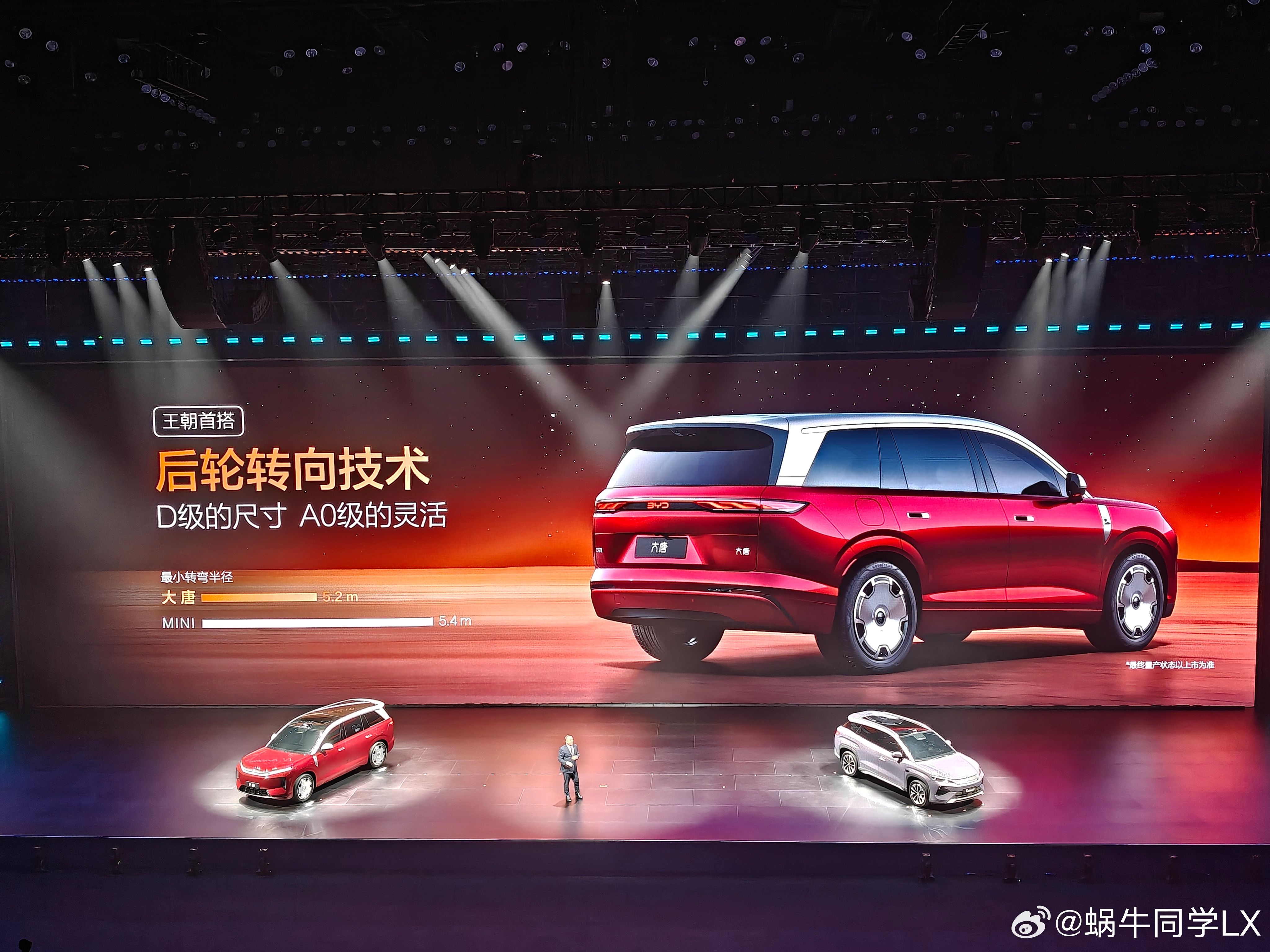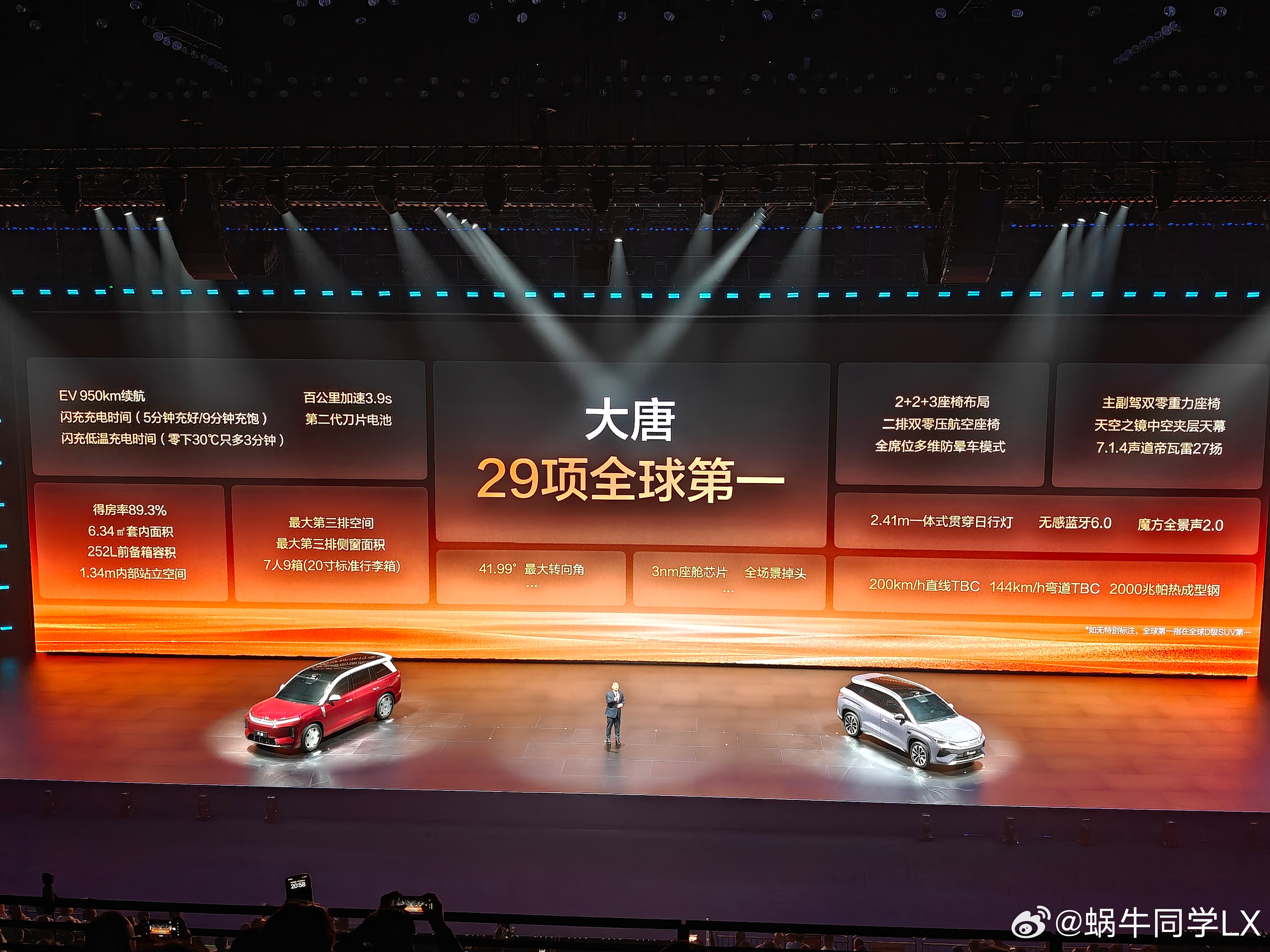 D级SUV的顶级掌控感 3月5日,比亚迪大唐在比亚迪闪充技术发布会上首次亮相。作为王朝网的旗舰车型,新车长宽高分别为5263/1999/1790mm,轴距达3130mm,定位为大型SUV。大唐拥有29项全球第一,四大“百万级”越级体验,950km超长续航,5.2m转弯半径,2+2+3布局,无论是三代同堂的家庭出行,还是跨省的商务接待,大唐都能轻松拿捏,是我心中理想的家庭旗舰座驾。大唐瞄准40万级别以上市场,搭载比亚迪第二代刀片电池和闪充技术等前沿科技,让王朝网与市场9字辈车型抗衡更有底气。大唐的新豪华与新技术的结合,相信会让本就竞争激烈的旗舰SUV市场再添一把火。