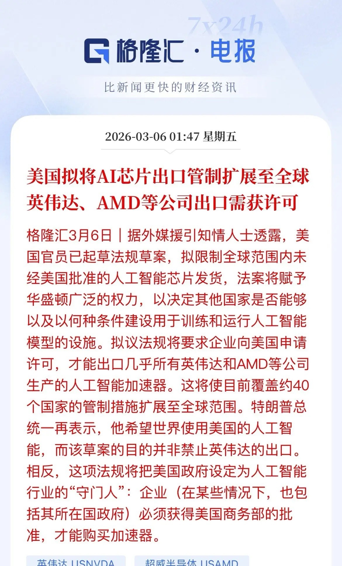 今天,据外媒爆料:美国拟将AI芯片出口管制扩展至全球,英伟达、AMD等公司出口需获美国商务部许可。