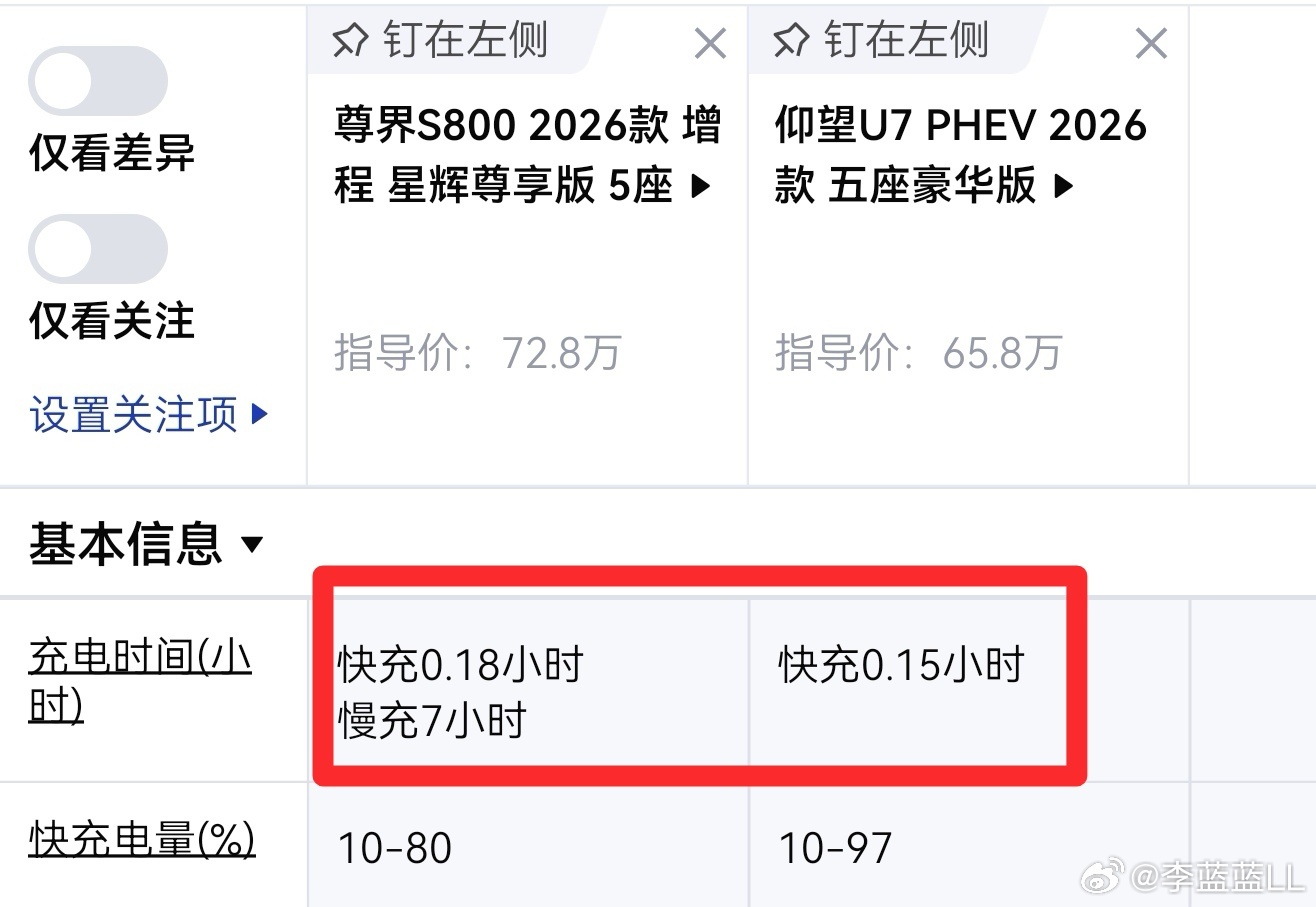 按配置表看。插混的U7确实是9分钟充饱。尊界S800要10分钟充饱。