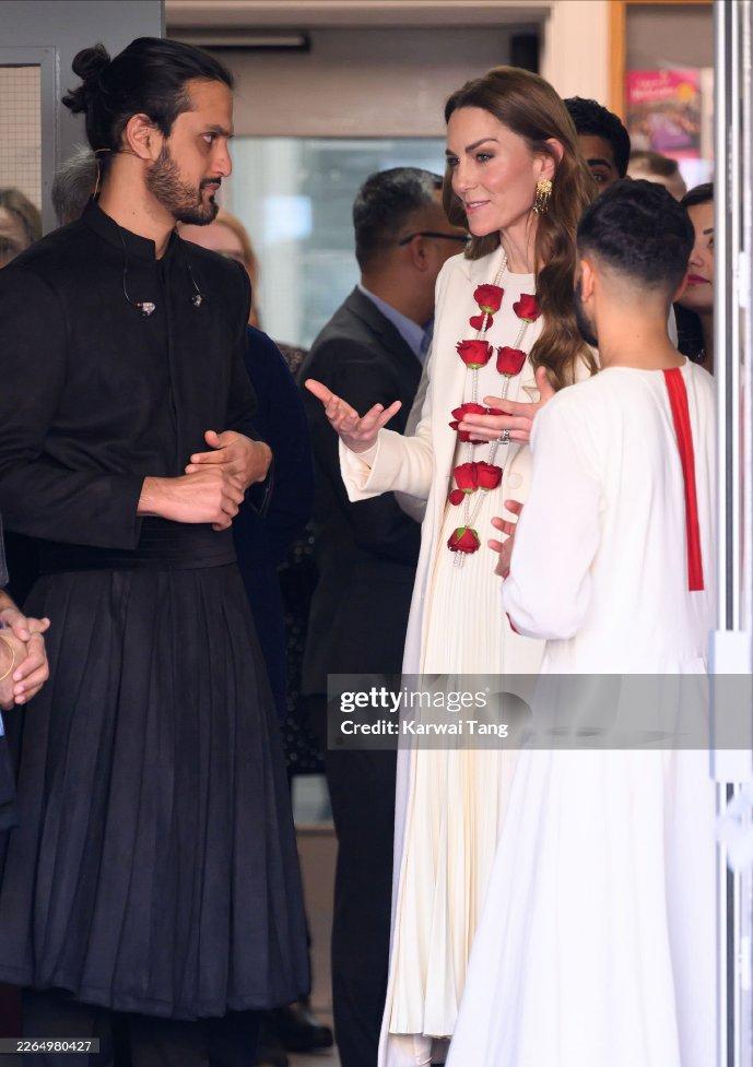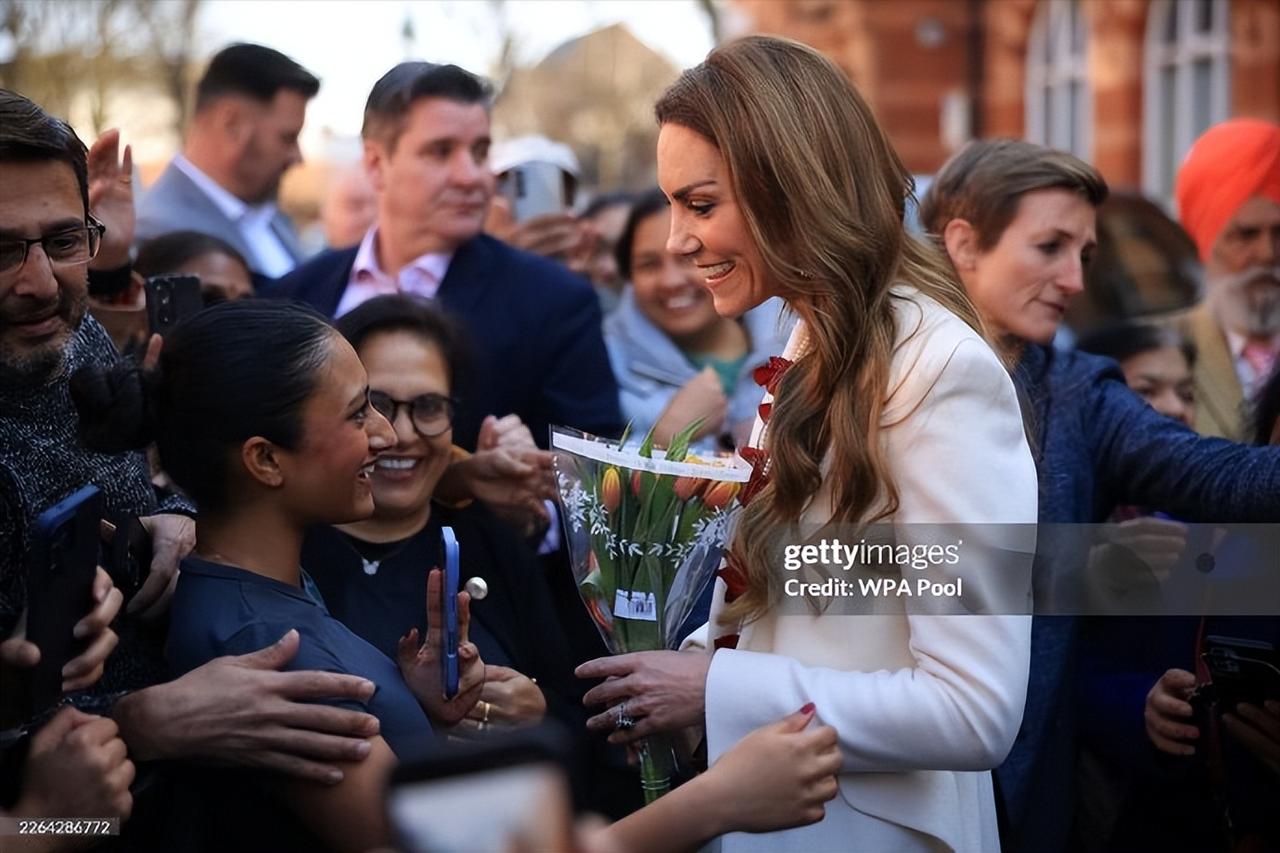 凯特今日可谓美若天仙[飞吻] 在英国莱斯特的印度社区,她获得玫瑰项链, 正好白色裙装+红玫瑰衬得她气色大好, 真心地祝福这位从低谷中走出来的王妃。 最后再放一张白色裤装的某妯娌对比玩玩[狗头]