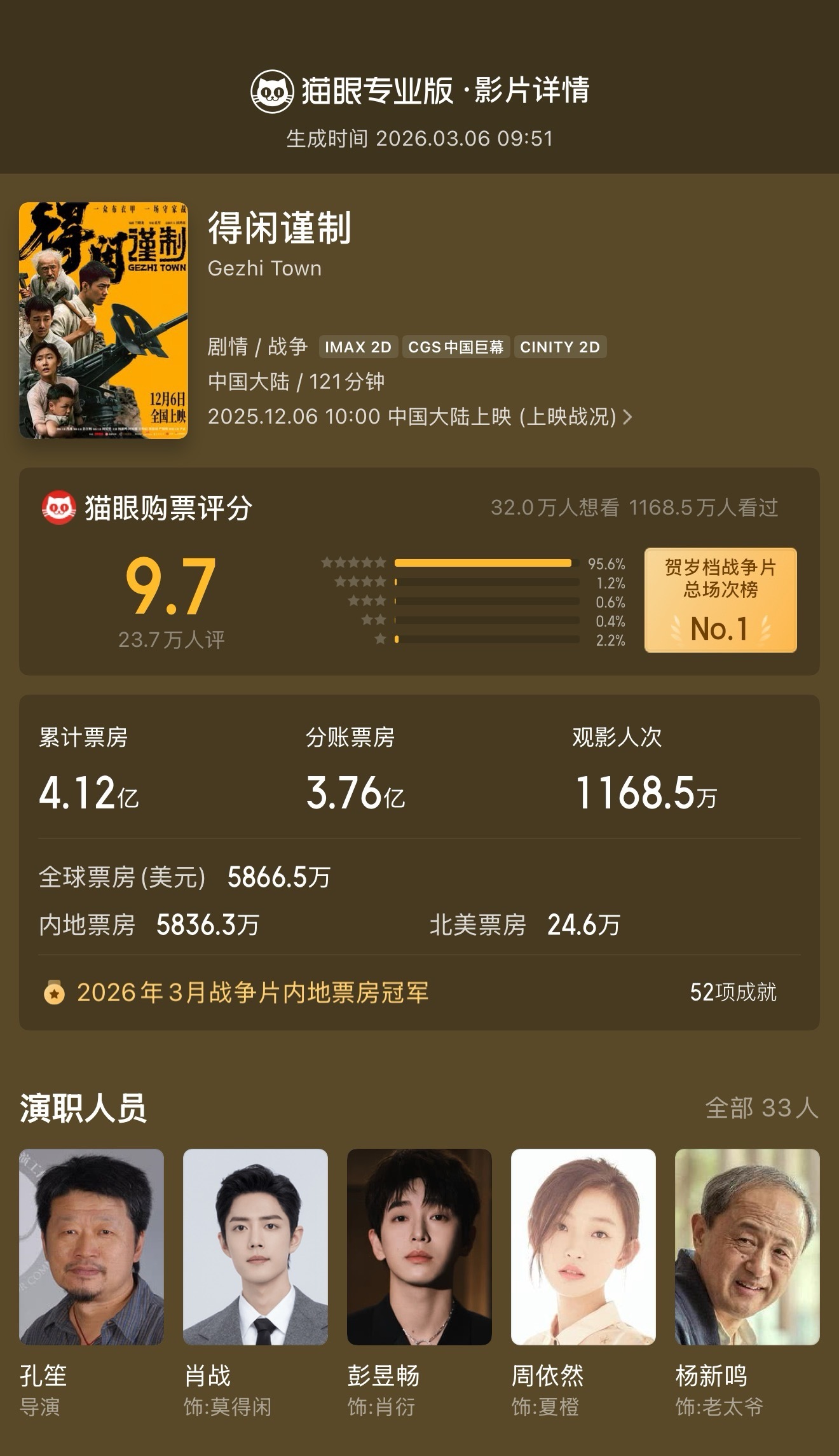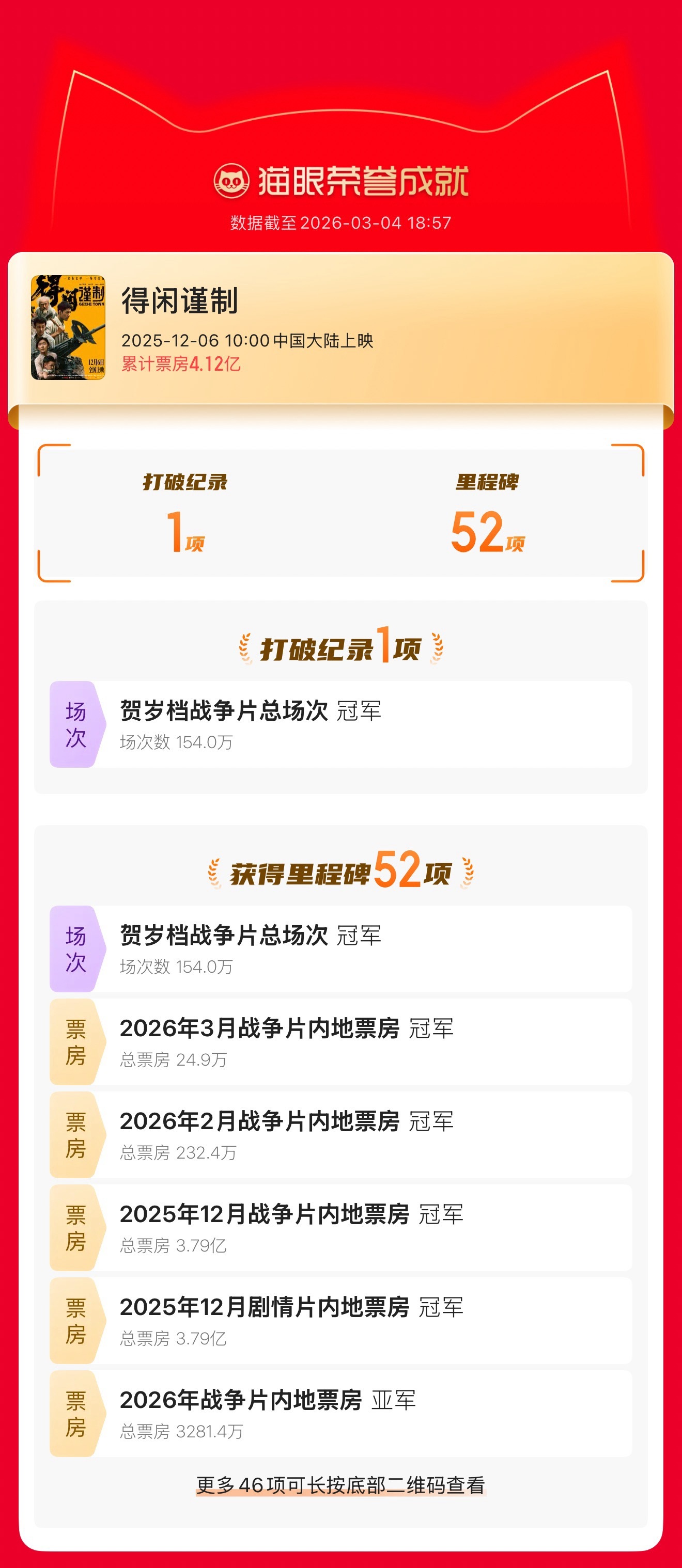 得闲谨制最终总票房4.12亿 据猫眼专业版数据,电影 《得闲谨制》3月5日结束放映,最终总票房4.12亿,共打破1项纪录,获得52项里程碑。
