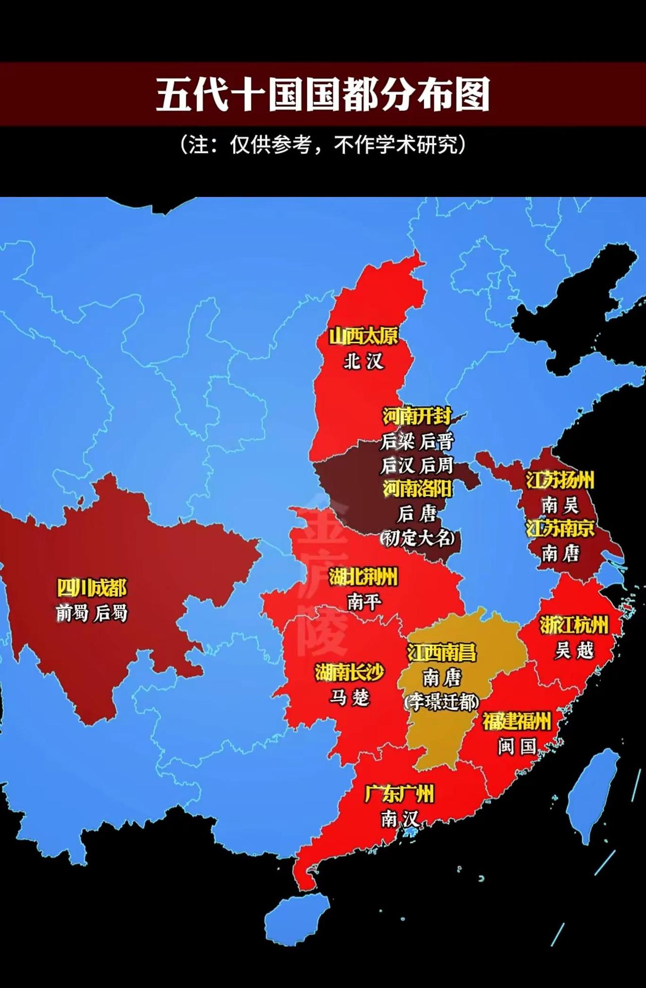 地图以不同颜色标注当时各政权的都城位置,涵盖五代(后梁、后唐、后晋、后汉、后周)与十国(前蜀、后蜀、南吴、南唐、吴越、闽国、南平、马楚、南汉、北汉)的核心统治区。从空间分布看,中原地区(河南开封、洛阳)是五代都城集中地,体现其作为政治中心的延续性;南方国都分布更分散,四川成都(前蜀、后蜀)、湖南长沙(马楚)、湖北荆州(南平)、江西南昌(南唐)、浙江杭州(吴越)、福建福州(闽国)、广东广州(南汉)、江苏扬州与南京(南吴、南唐)、山西太原(北汉)等,反映南方政权多依托区域中心或地理形胜建都。分布既因北方长期为政治核心,五代政权争夺中原控制权;也因南方战乱相对较少,地方势力据地称雄,都城多位于交通要冲或经济富庶区,体现当时南北政治格局的分裂与区域化特征。地图直观呈现了五代十国时期政权割据、都城多元的空间态势,为理解这一分裂时期的国家结构、地域势力博弈提供了可视化参考。