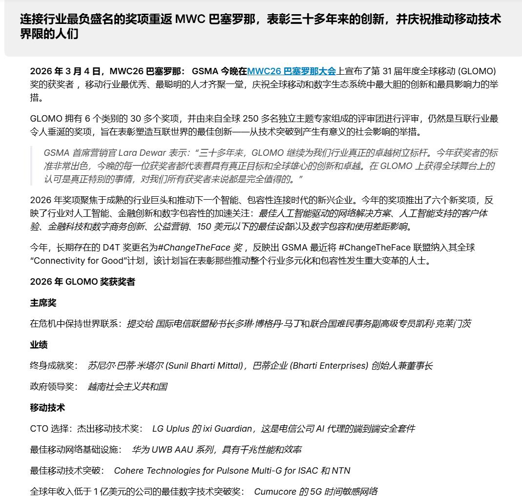 MWC26 巴塞罗那期间,华为获得的8项大奖,究竟有哪些?含金量有多高? 2026年世界移动通信大会(MWC26 巴塞罗那),于2026年3月2日至5日举行,在这场全球行业瞩目的大会上,华为是斩获了GSMA全球移动大奖的8项重磅奖项,奖项如下: 1、最佳移动网络基础设施奖 2、最佳AI使能网络解决方案 3、最佳非地面网络方案 4、最佳移动互联消费者运营商服务奖 5、最佳移动互联健康与福祉创新奖 6、最佳金融科技与数字商务创新奖 7、最佳移动无障碍与普惠应用奖 8、改善儿童和青少年生活的最佳移动创新 我在GSMA全球移动大奖的官网也查询了一下,一共设置了31项大奖,华为的获奖占比可以说是超过了四分之一。可以看到,华为依旧是遥遥领先。 在这次大会上,华为最受瞩目的应该是Atlas 950 SuperPoD和TaiShan 950 SuperPoD两款超级计算集群了,这是华为在全球算力圈扔出的重磅炸弹。可以看到,和国际行业巨头的抗衡,华为的脚步一直都没有停止过。 还有,我也看到另外一家国内通信行业王牌——中兴通讯则是获得了3项大奖: 1、最佳专用网络解决方案奖 2、开放网关挑战奖 3、最佳活动营销奖 如果说2023年是华为回归的一年,2025年是华为稳住阵脚的一年,那么,2026年,一定是华为大放异彩的一年。 从操作系统到SOC,从AI到汽车,从连接万物到智联万物,华为正在编织一张从技术底层到应用终端的大网。2026年,一定也是这张网开始展现其全部力量的时刻。 华为,不会让大家失望的!
