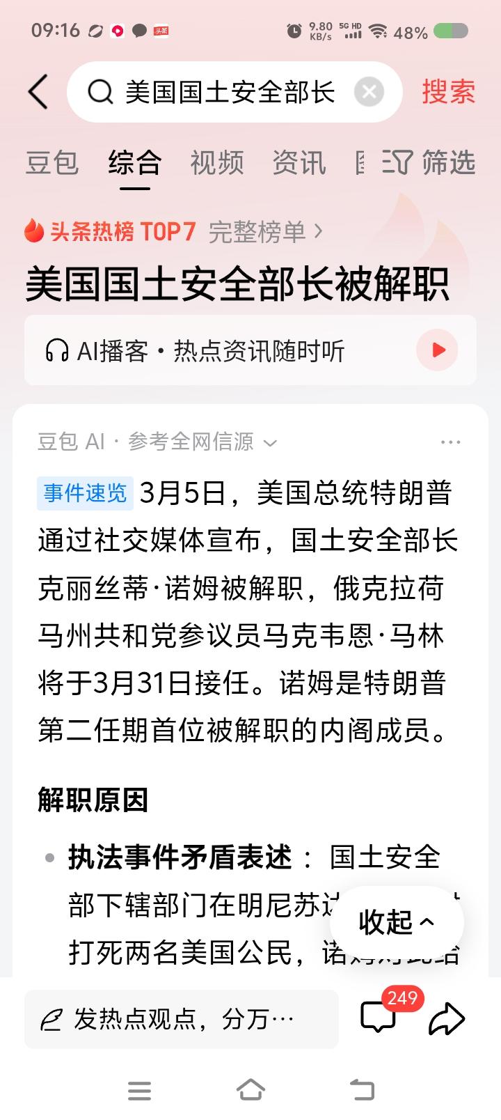 诺姆成为牺牲品?—— 据报道,3月5日,特朗普解除国土安全部部长诺姆的职务。新部长3月底就职。 点评: 前几天,看到视频:她在国会听证会接受质询时,强词夺理,打断别人问话,拒不反省,答非所问。我想,这个女人怎么上台的?智商、情商均不在线,还自以为是。 今天得知,她下台了! 又看到了相关视频。 下台原因是多方面的。直接原因是上面说的,态度问题。已成为特朗普政府的包袱。 根本原因是,他主导的国土安全部下属的移民局特工几次枪杀美国人,以执法为名行暴政之实;而且,阻碍有关人员调查这些事件;而且,她不承认阻碍一事。种种证据显示,一个无能、专横、不反省的部门负责人,终将成为权力的牺牲品。 历史告诉我们,高层可能不明智,但不能全任用无能之辈。 此人其它问题还有:几亿预算的移民广告,她宣称总统已审批。很快,特朗普否认。 总结: 她在干什么?她有工作计划么?她有判断力么?好歹当过州长,怎么垮成这样?