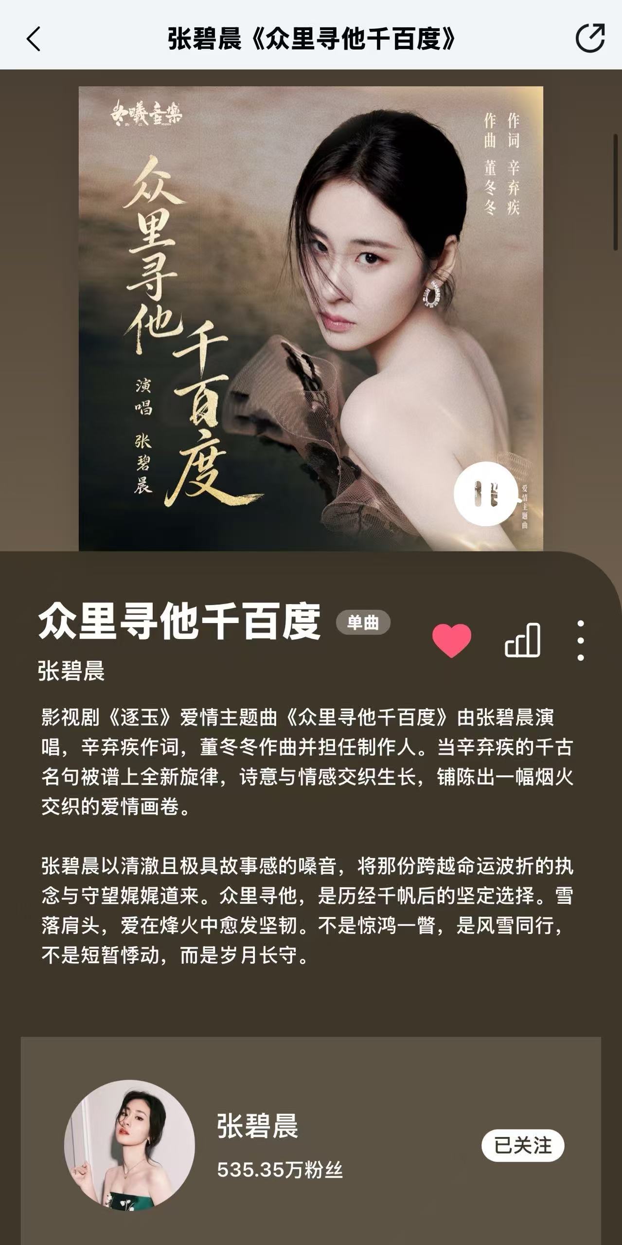 张碧晨逐玉OST上线张碧晨献唱逐玉爱情主题曲 古韵新声,柔情百转。张碧晨演绎《众里寻他千百度》,把《逐玉》中的痴情守候,唱进每个期待爱情的人心里。