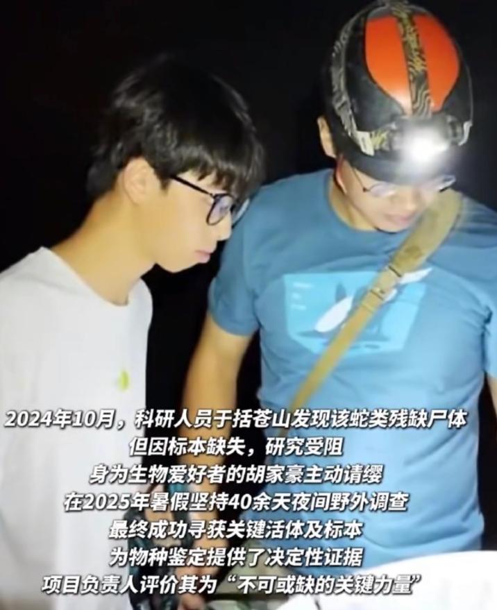 封神了家人们!17岁高三男生,凭一己之力干出了科研圈大事🔥 浙江临海的胡家豪,才17岁,还在备战高考。 却硬生生在括苍山上,发现了新物种! 就是那条被网友叫“筷子蛇”的括苍山脊蛇,通体褐棕,细得像筷子,无毒还特别隐蔽。 谁能想到? 专家都没找到的完整标本,他熬夜刷山40多夜,往返百公里,一点点挖了出来。 不是运气,是真热爱、真坚持! 从小痴迷生物,跑山、拍标本、查资料,把爱好玩成了专业。 更牛的是,相关论文直接登上了SCI国际期刊! 要知道,这可是很多科研人一辈子都在追求的目标啊! 有人酸他运气好,可我想说,没有日复一日的坚守,哪来的“好运”? 17岁的青春,不是只有刷题和考试。 这份对自然的敬畏,对热爱的执着,才是最酷的模样! 少年强则国强,这才是我们该追的星🌟 17岁男生发现新物种筷子蛇登上SCI 05后少年的科研逆袭 热爱可抵万难 筷子蛇新物种科普