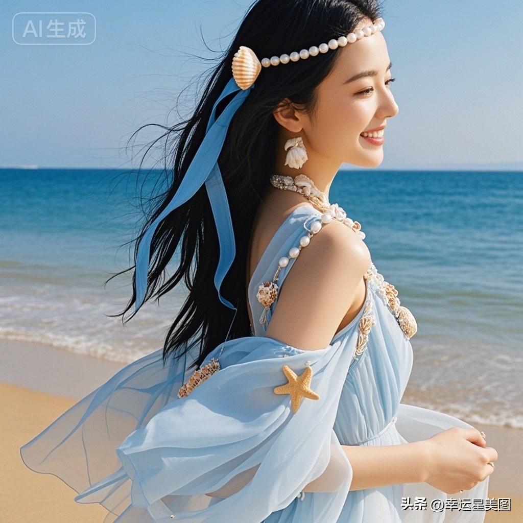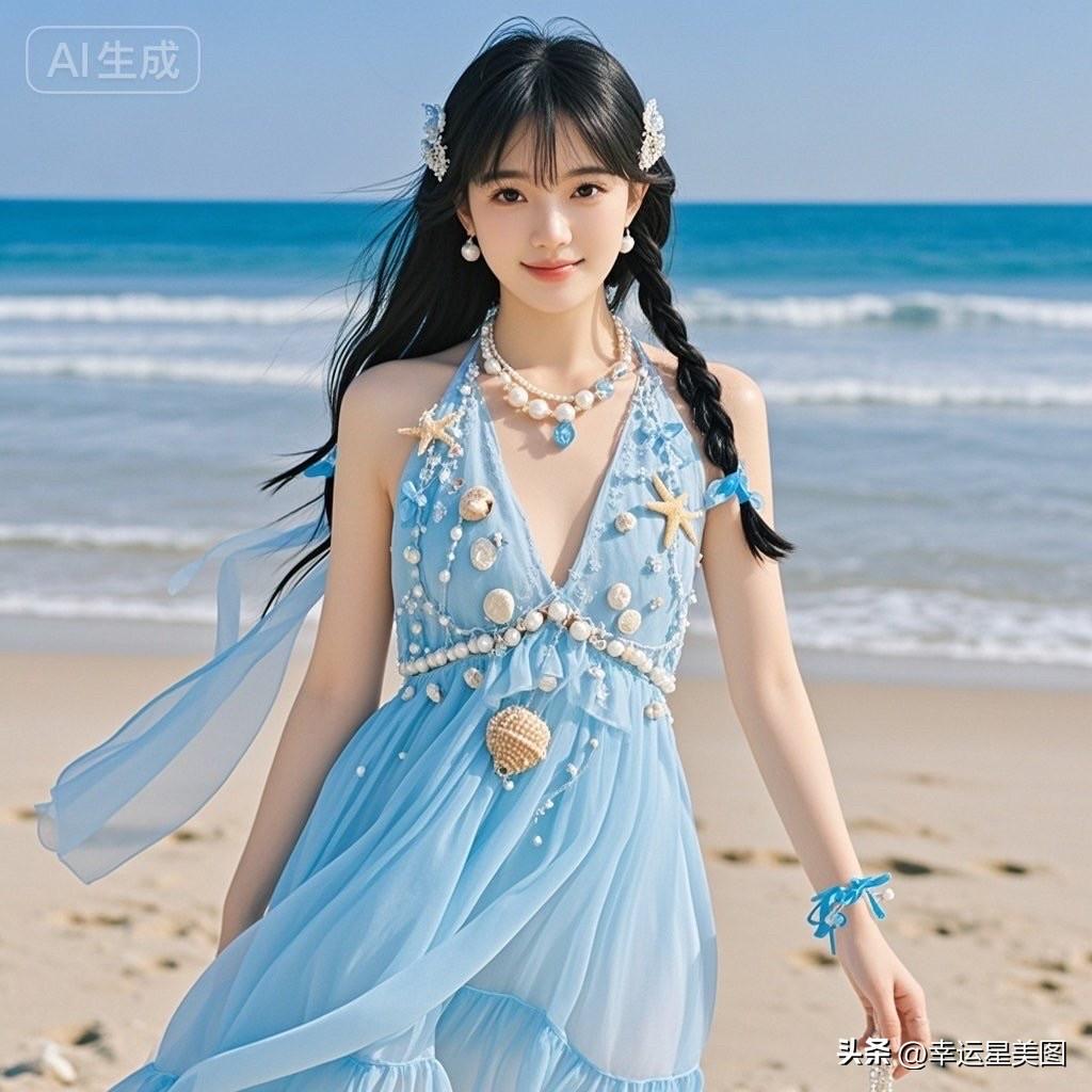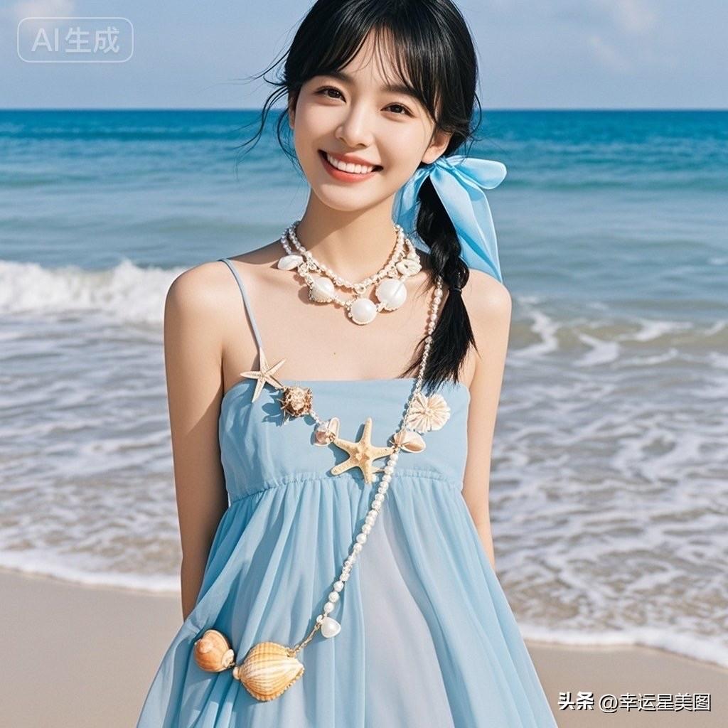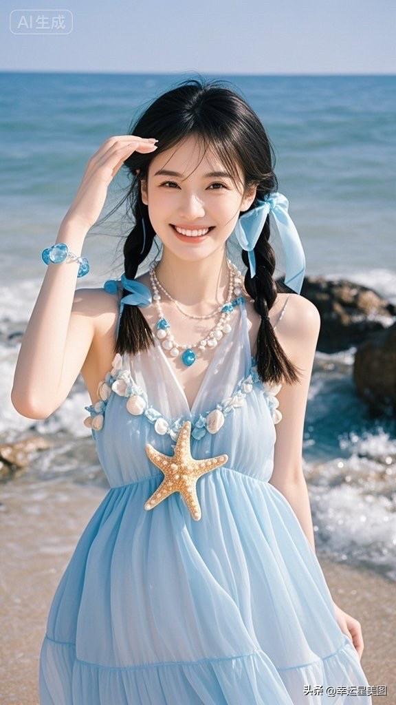 海边少女风,蓝白相间,清新自然,甜美笑容,海浪轻拂,梦幻沙滩。