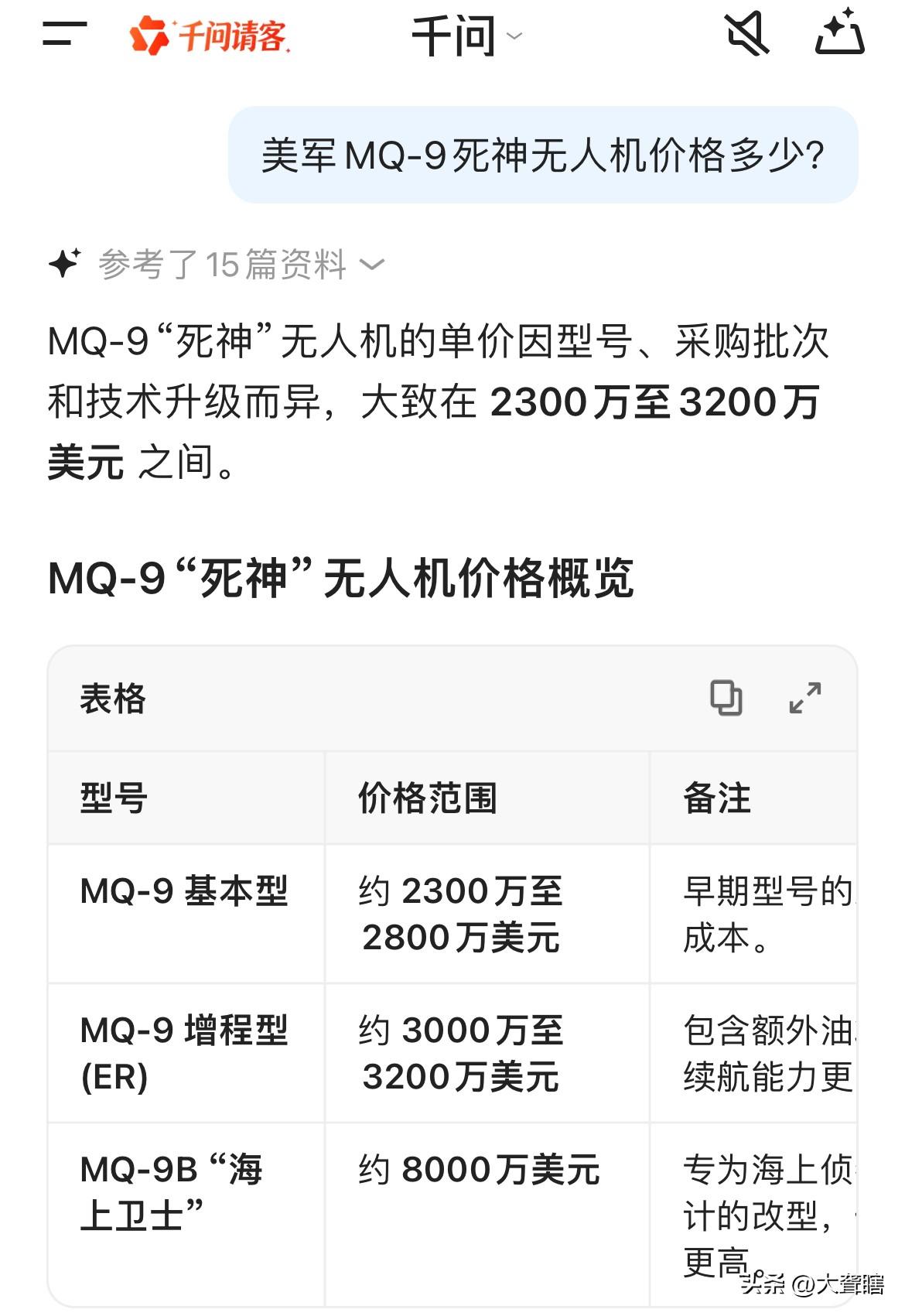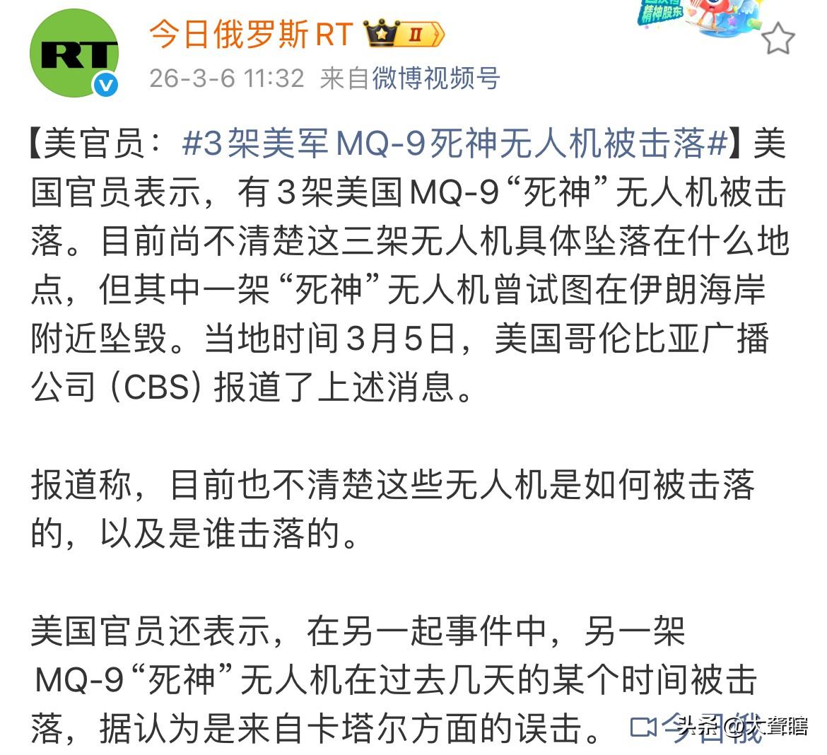 美军再损失3架「死神无人机」 据外媒消息,有美国官员表示3架美军MQ-9‘’死神无人机‘’被击落,但是并不清楚飞机具体是如何被击落以及击落的主体又是谁。 据悉,美军该型号飞机造价极其昂贵,采购价格在2300至3000美元左右,美军此次损失还是很严重的。