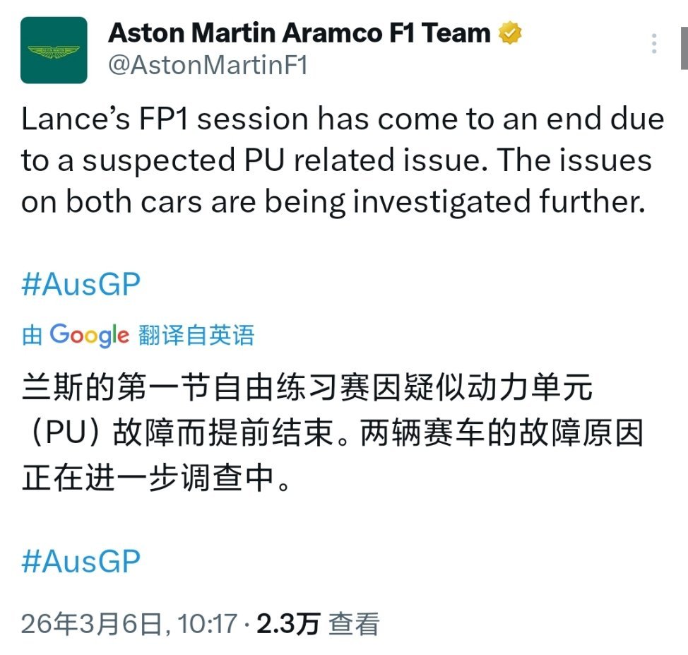 阿斯顿马丁车队在FP1全军覆没,斯托尔赛车因疑似动力单元问题正在检查,无法继续参加FP1F1赛车2026F1澳大利亚大奖赛