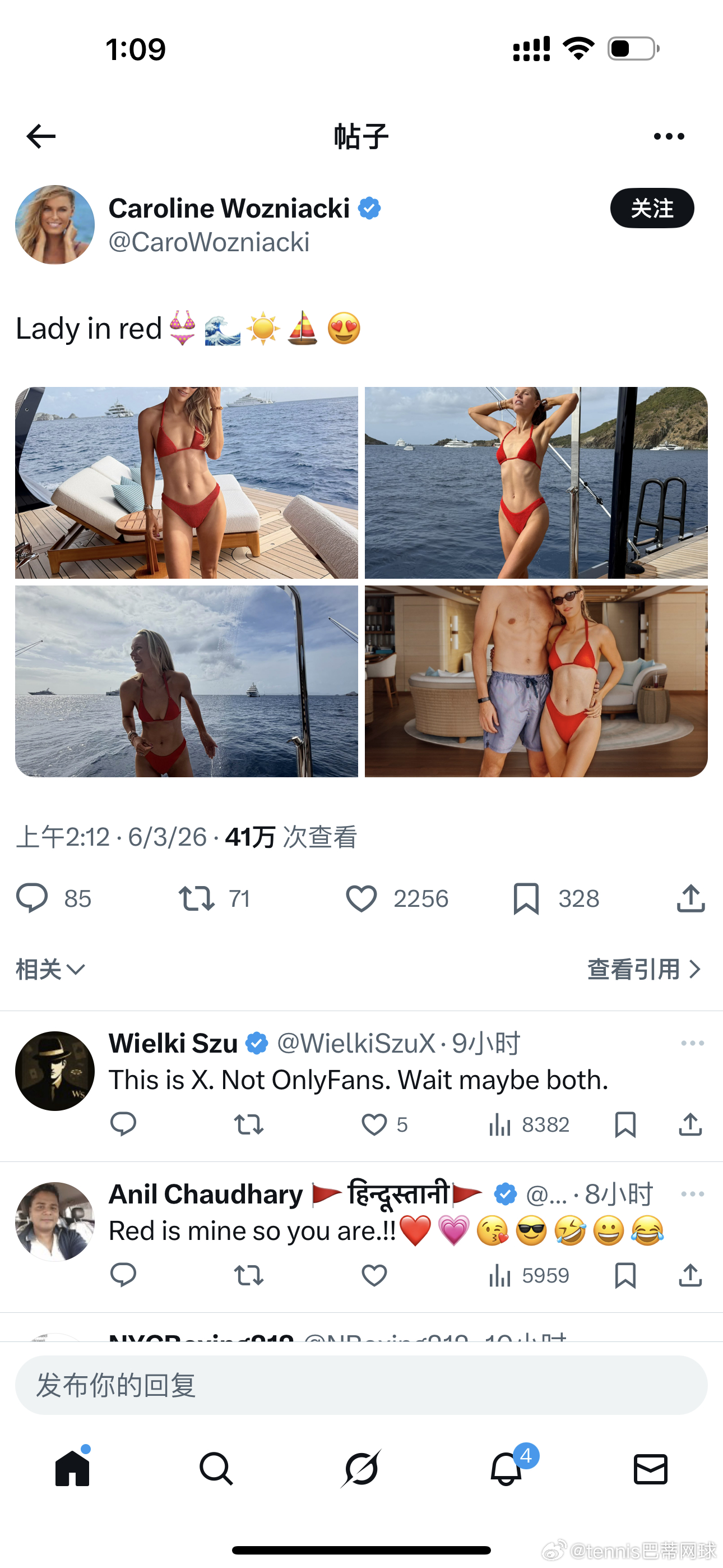 沃兹尼亚奇更新了推特:“穿红衣服的女士👙🌊☀️⛵️😍”