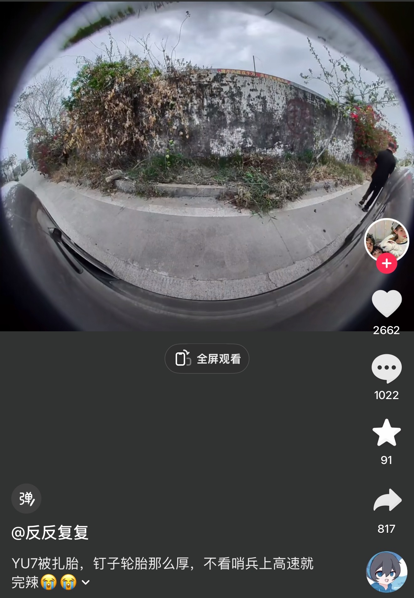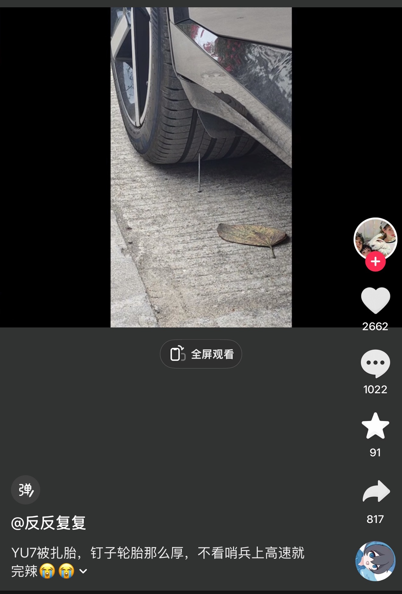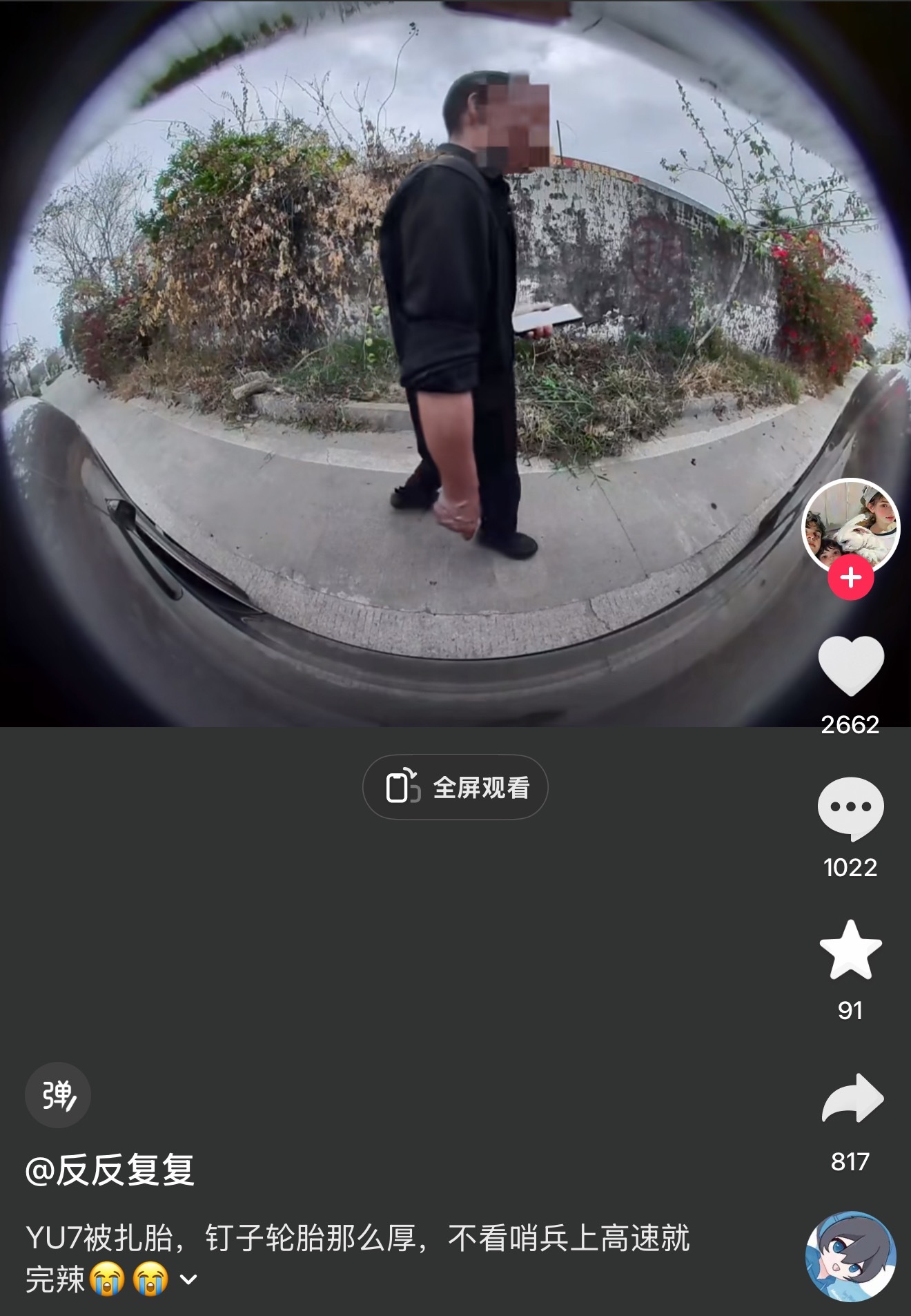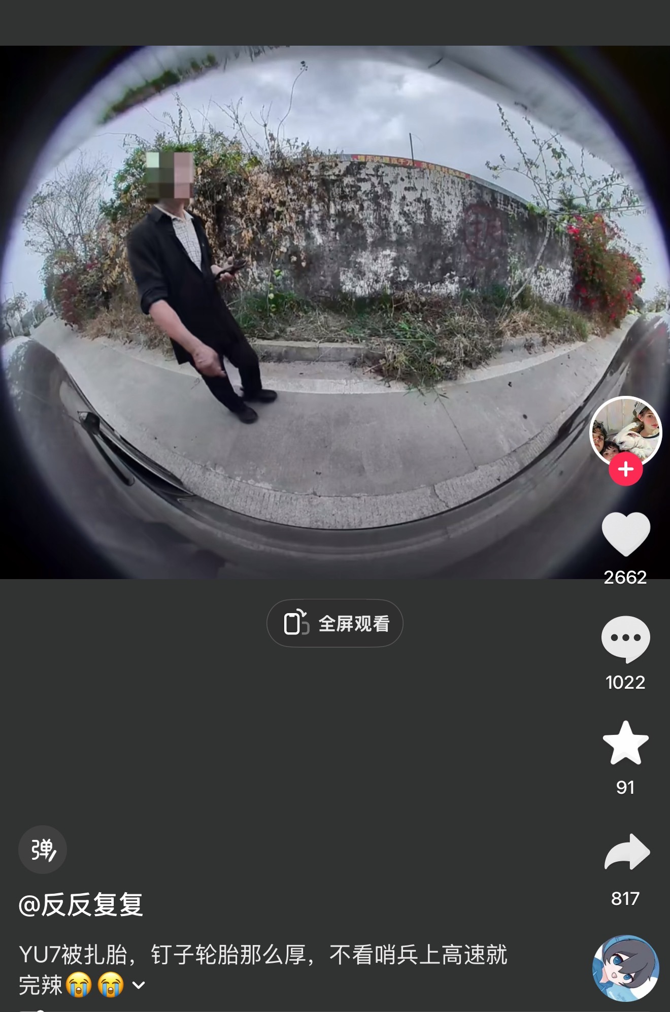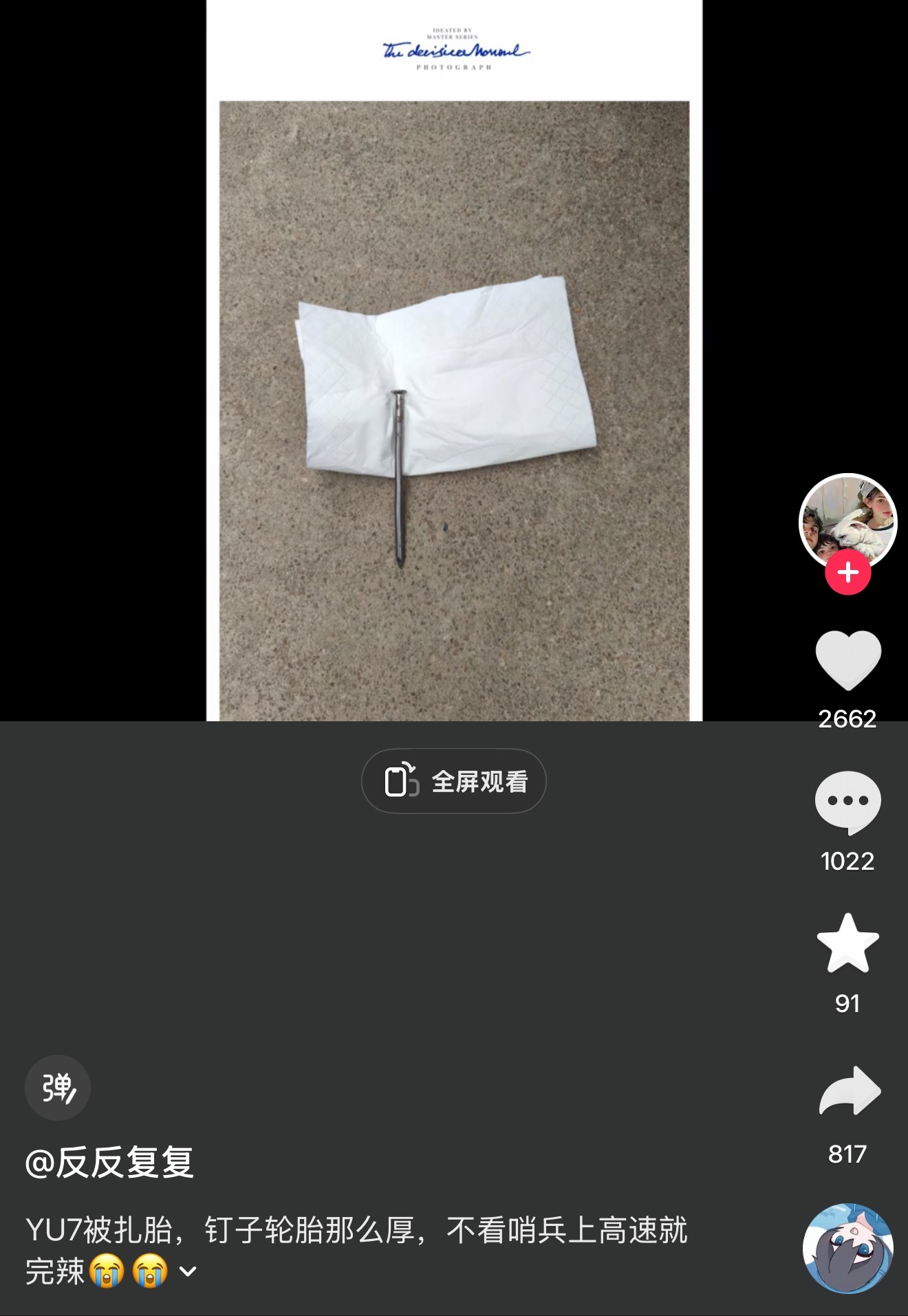 前两天刷到这么一个视频,有一位车友的小米YU7被人故意放钉子扎胎,幸好这位车主看