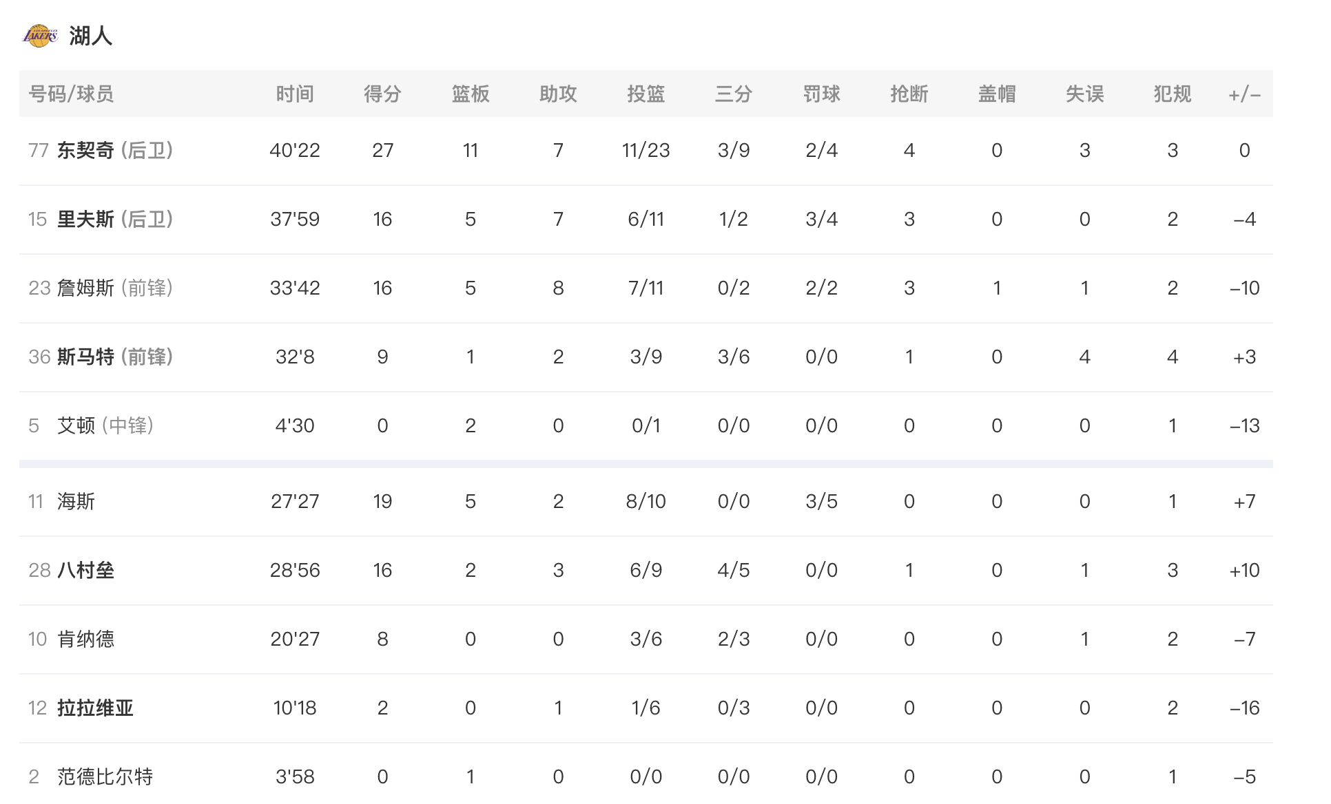 詹姆斯16分5篮板8助攻3抢断1盖帽,东契奇27分11篮板7助攻4抢断,里夫斯16分5篮板7助攻3抢断,斯玛特9分1篮板2助攻,八村16分2篮板3助攻,海斯19分5篮板2助攻,肯纳德8分,拉拉维亚2分。